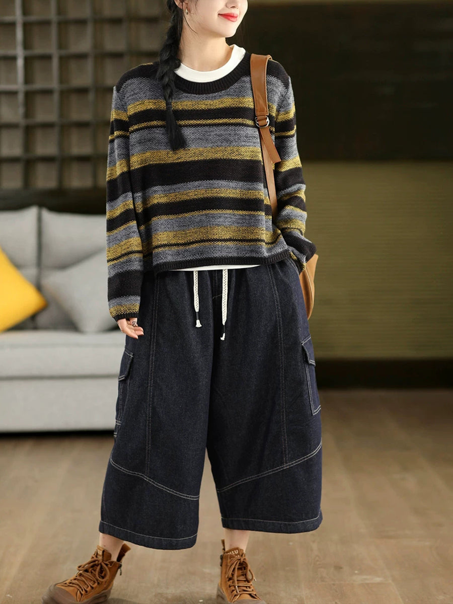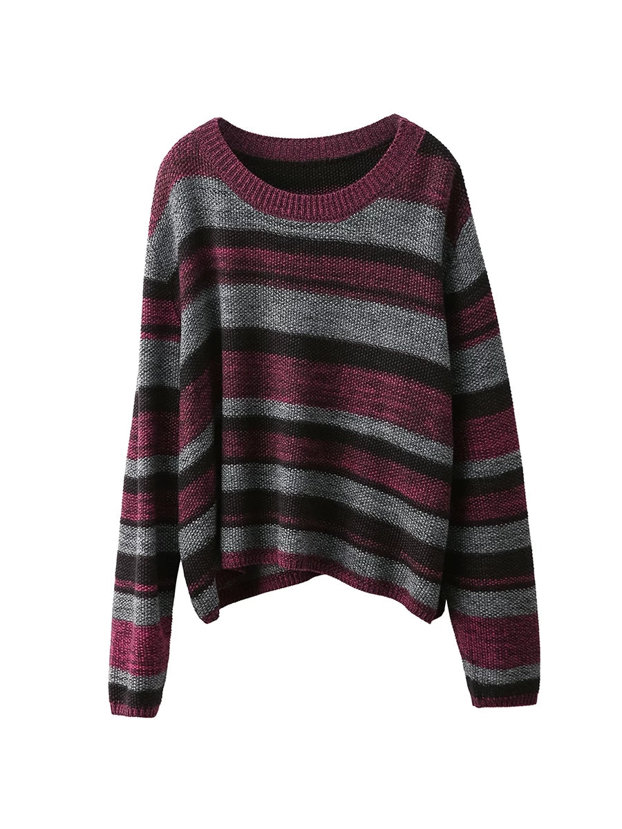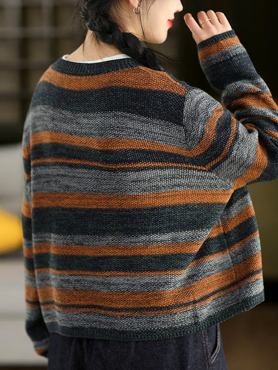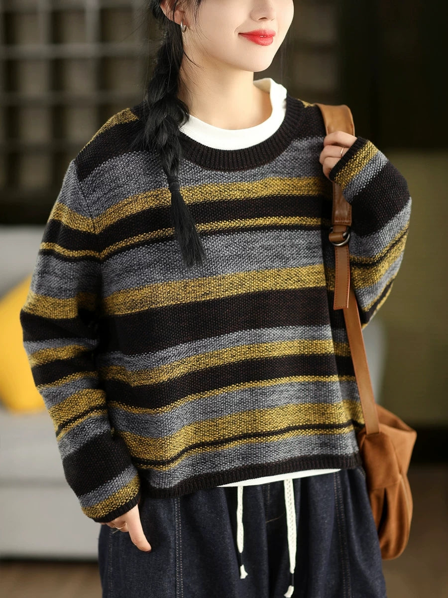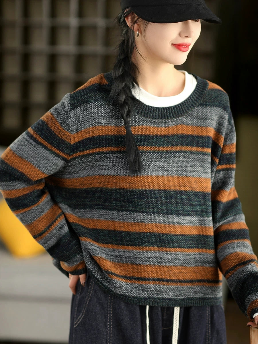 Women Retro Spring Stripe O-Neck Sweater