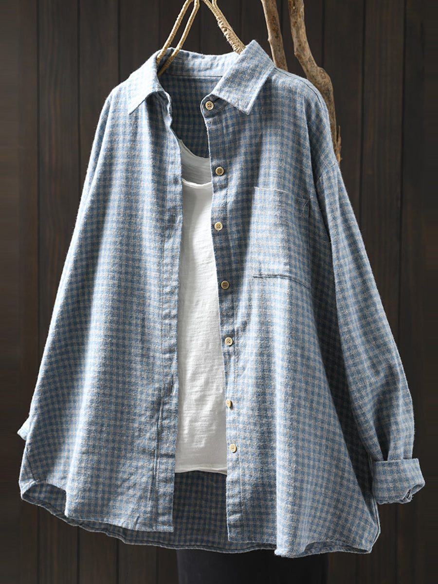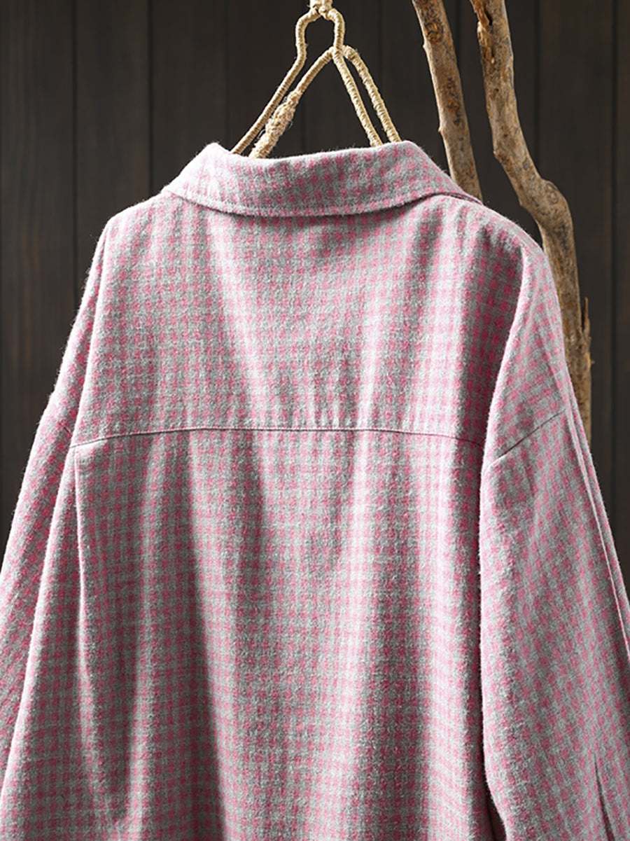 Women Autumn Plaid Turn-down Collar 100%Cotton Shirt