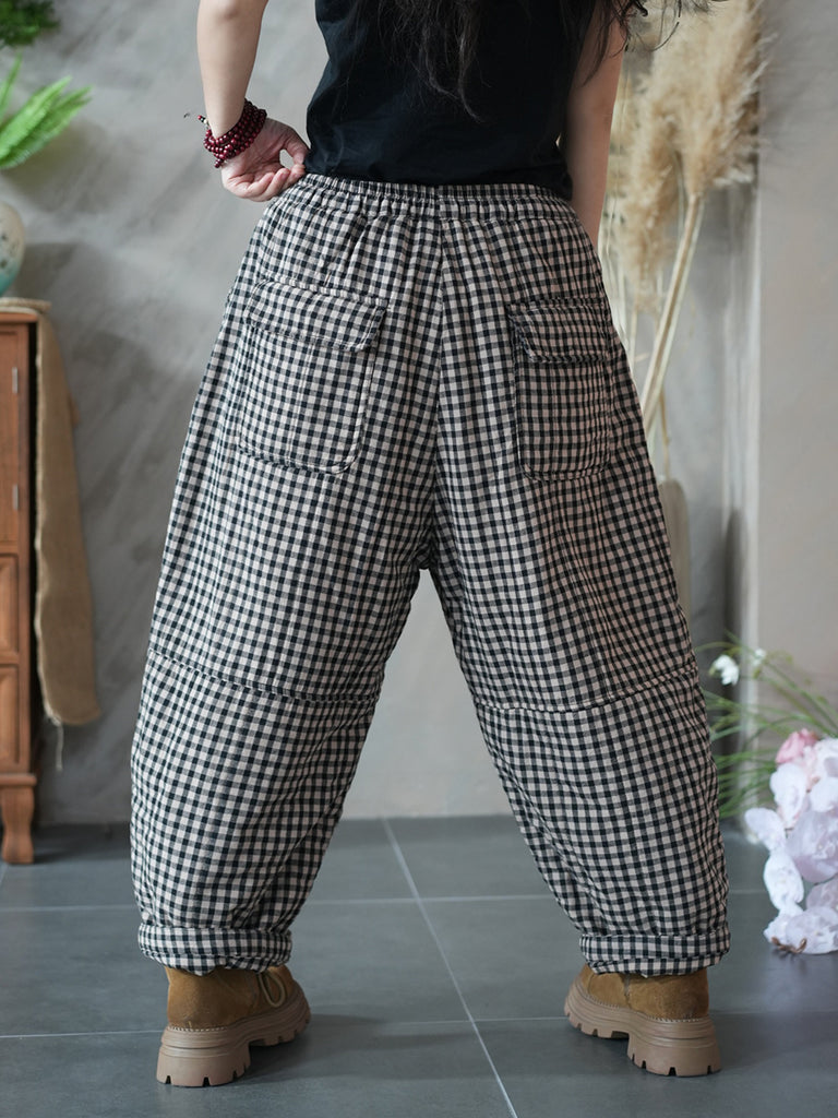 Women Winter Retro Plaid Fleece-lined Wide-leg Pants
