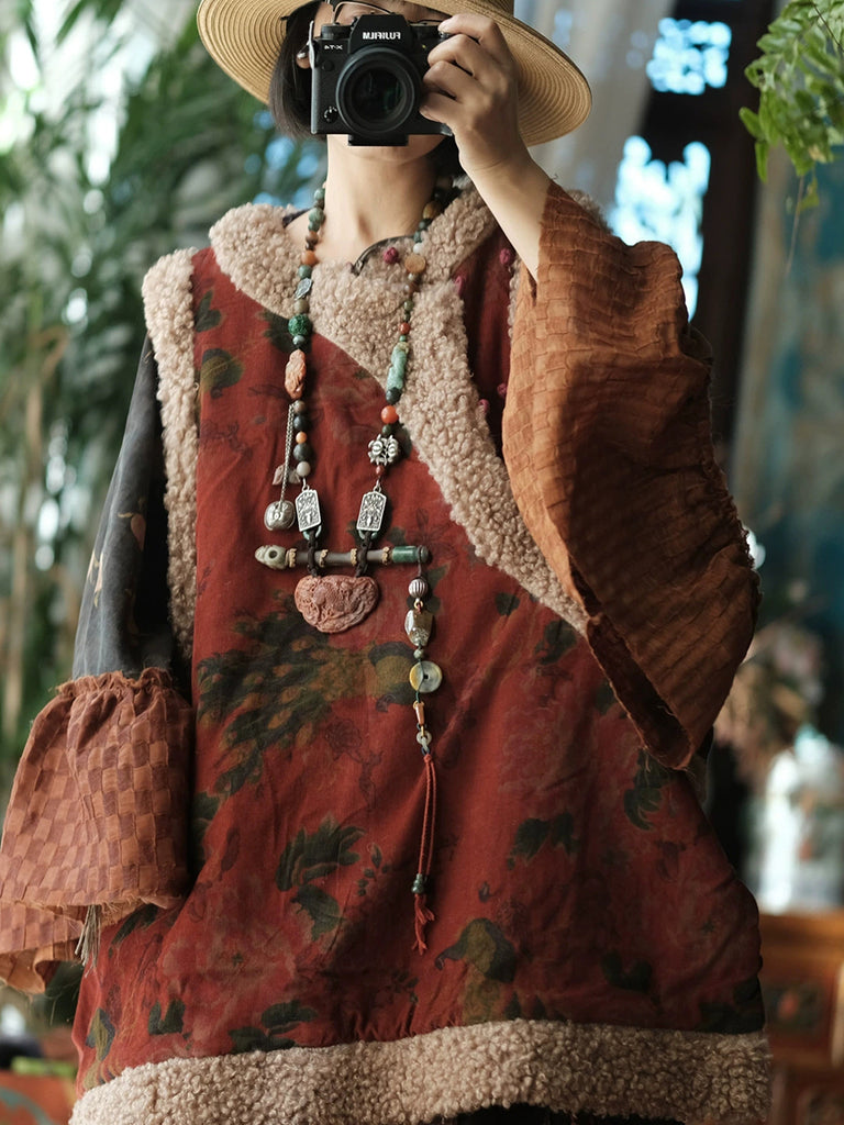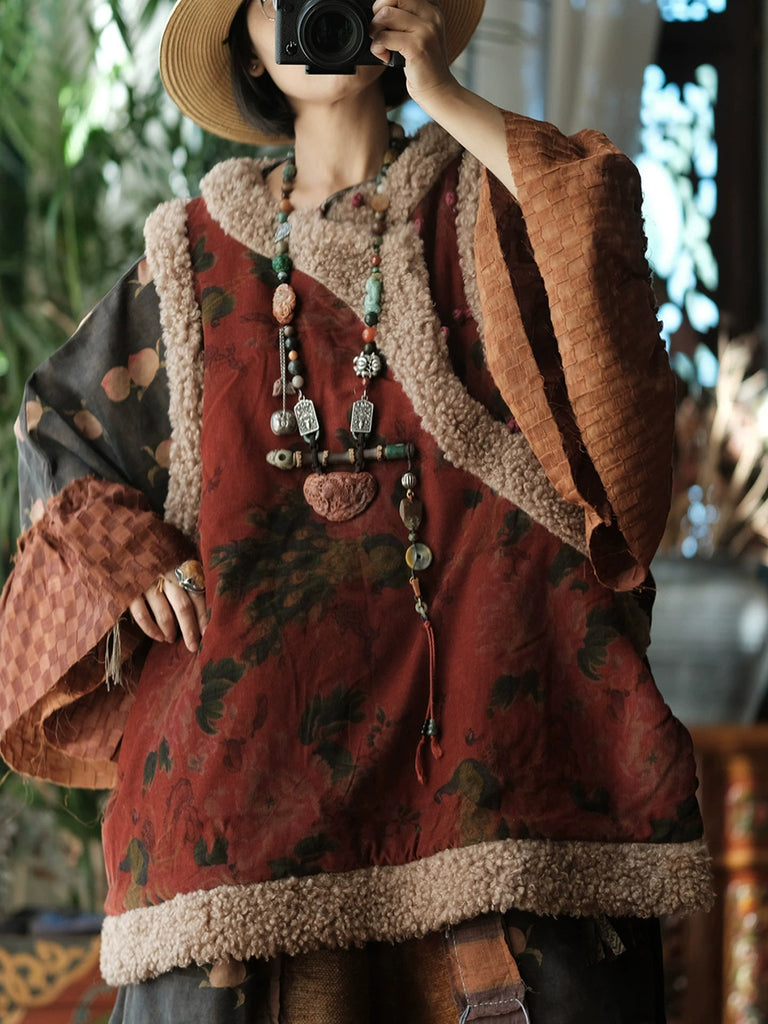Women Winter Vintage Flower Fleece Spliced Padded Vest