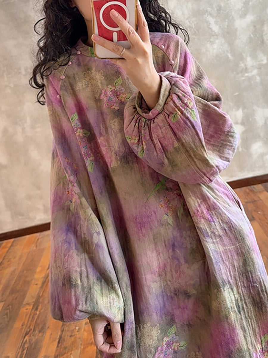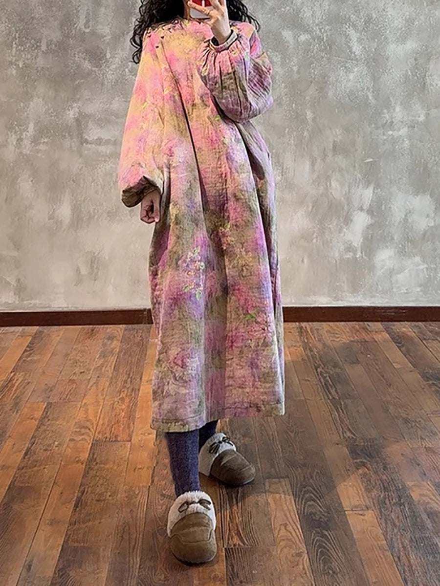 Women Autumn Tie-dye Stand Collar 100%Cotton Loose Dress