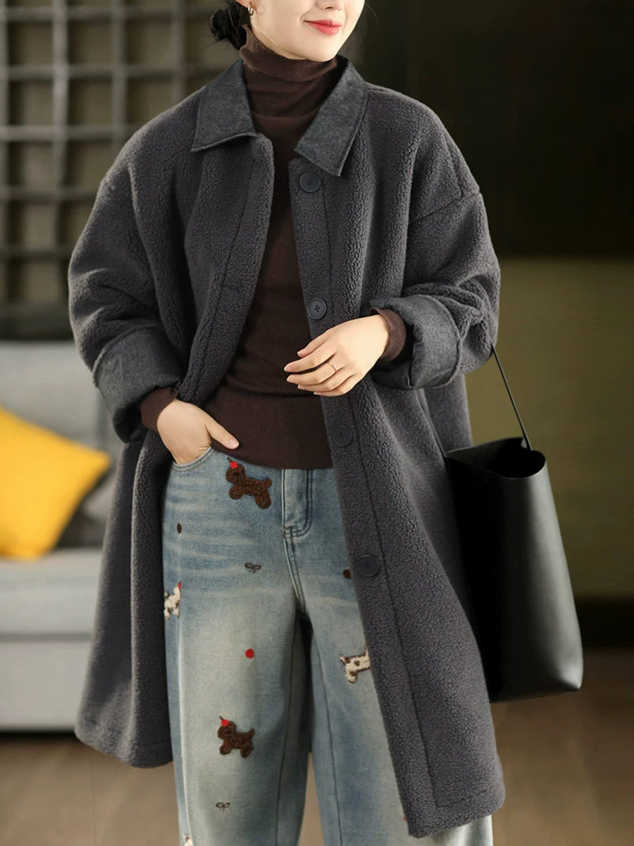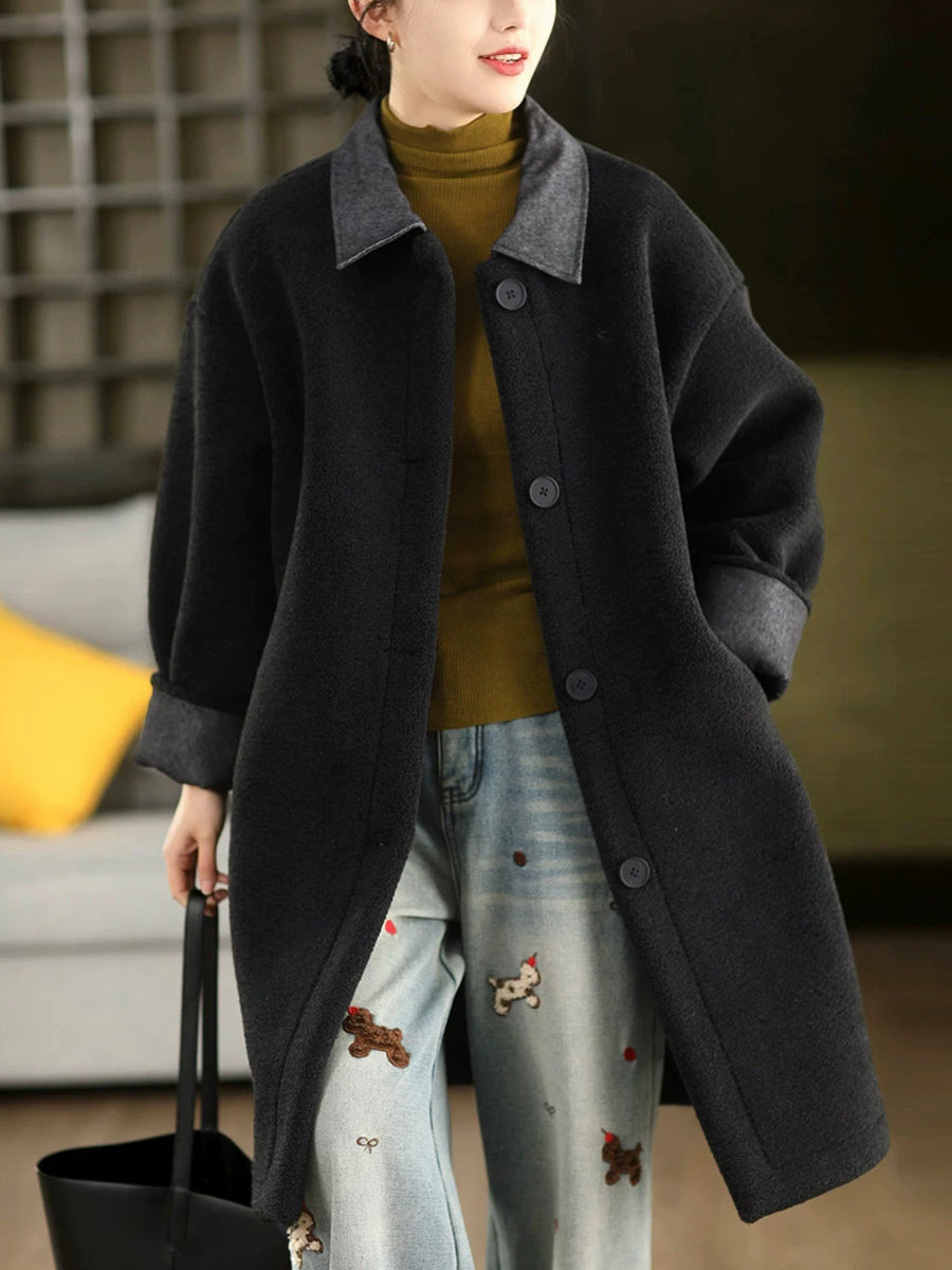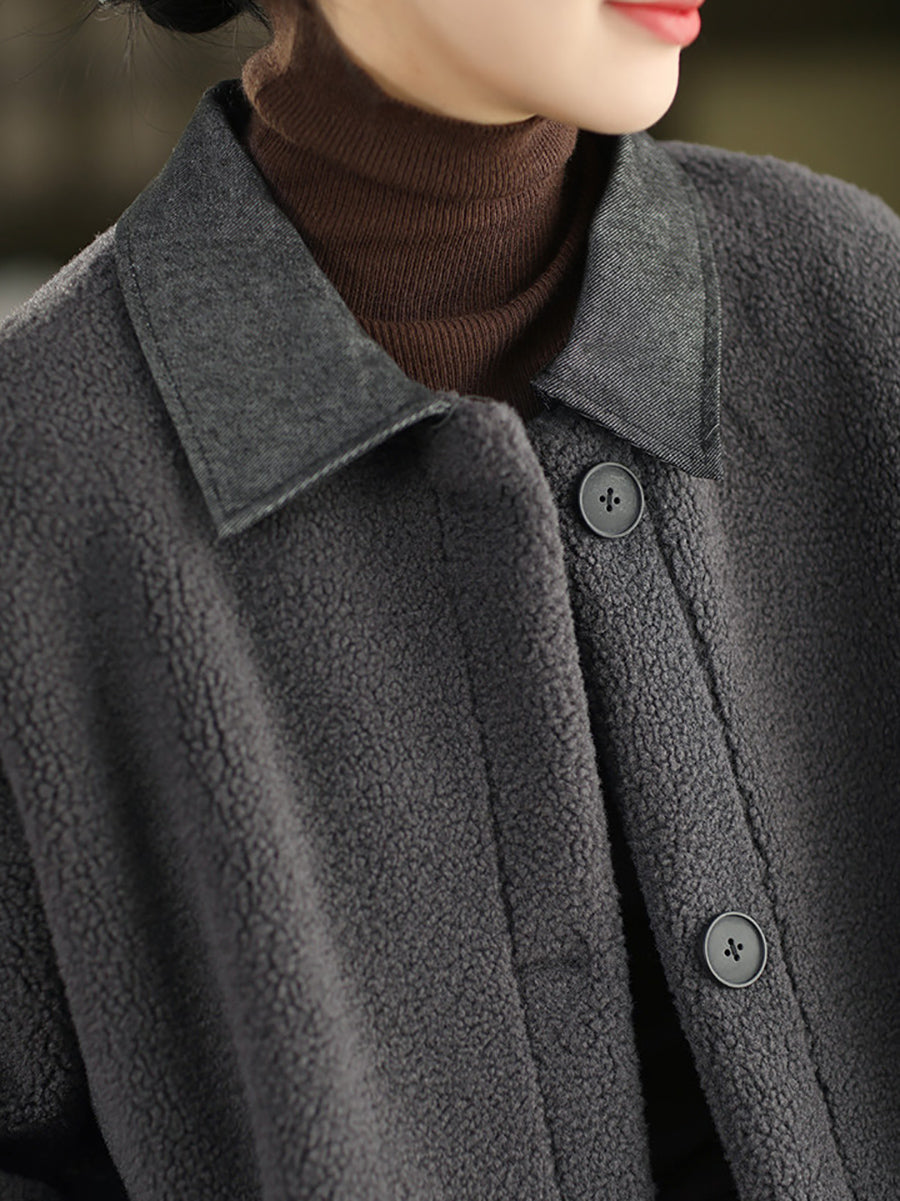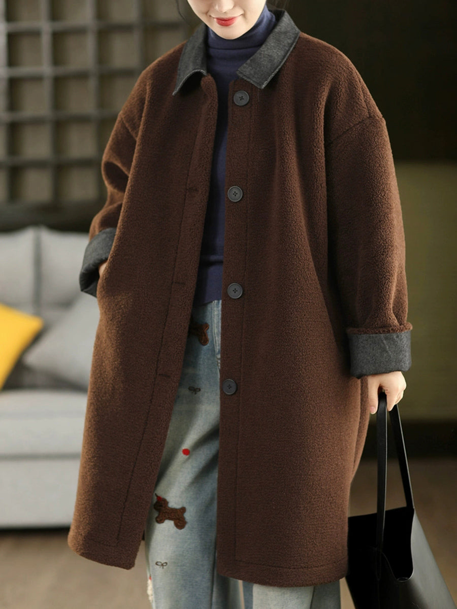 Women Winter Colorblock Turn-down Collar Fleece Coat