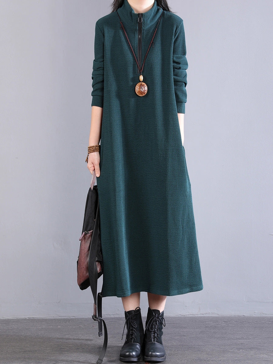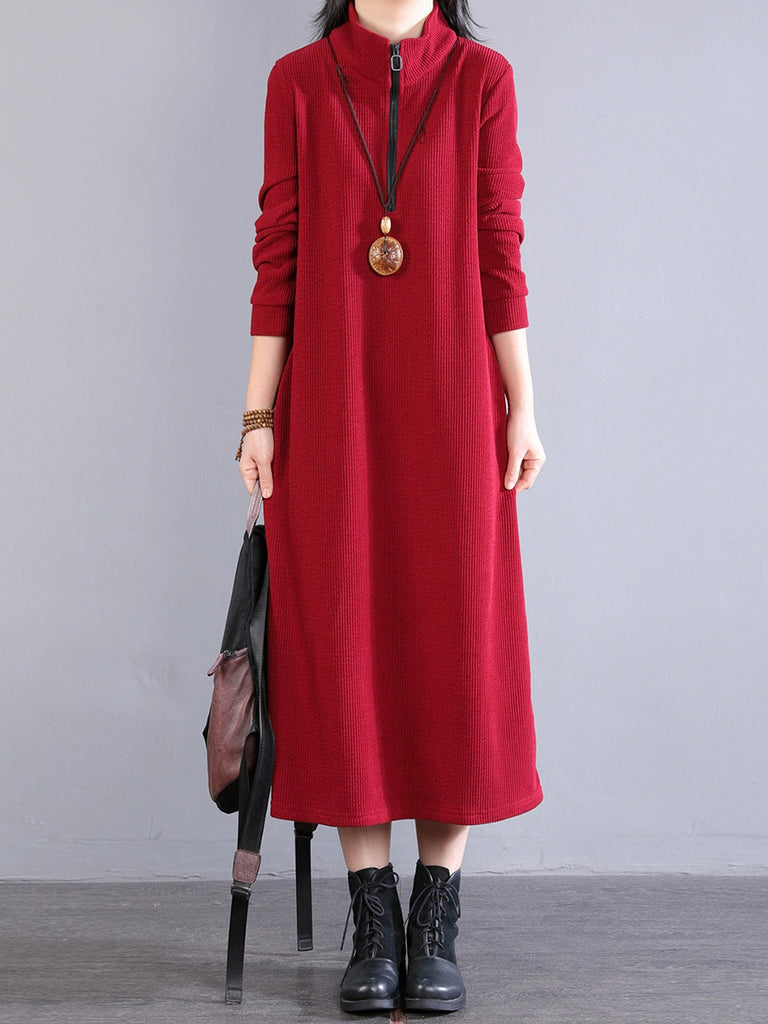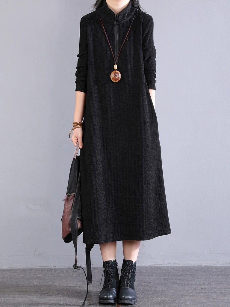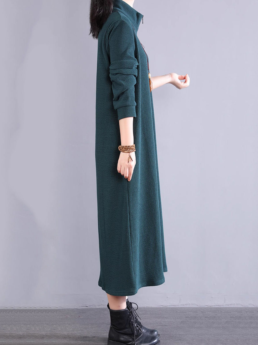 Women Autumn Pure Color 100%Cotton Stand Collar Dress