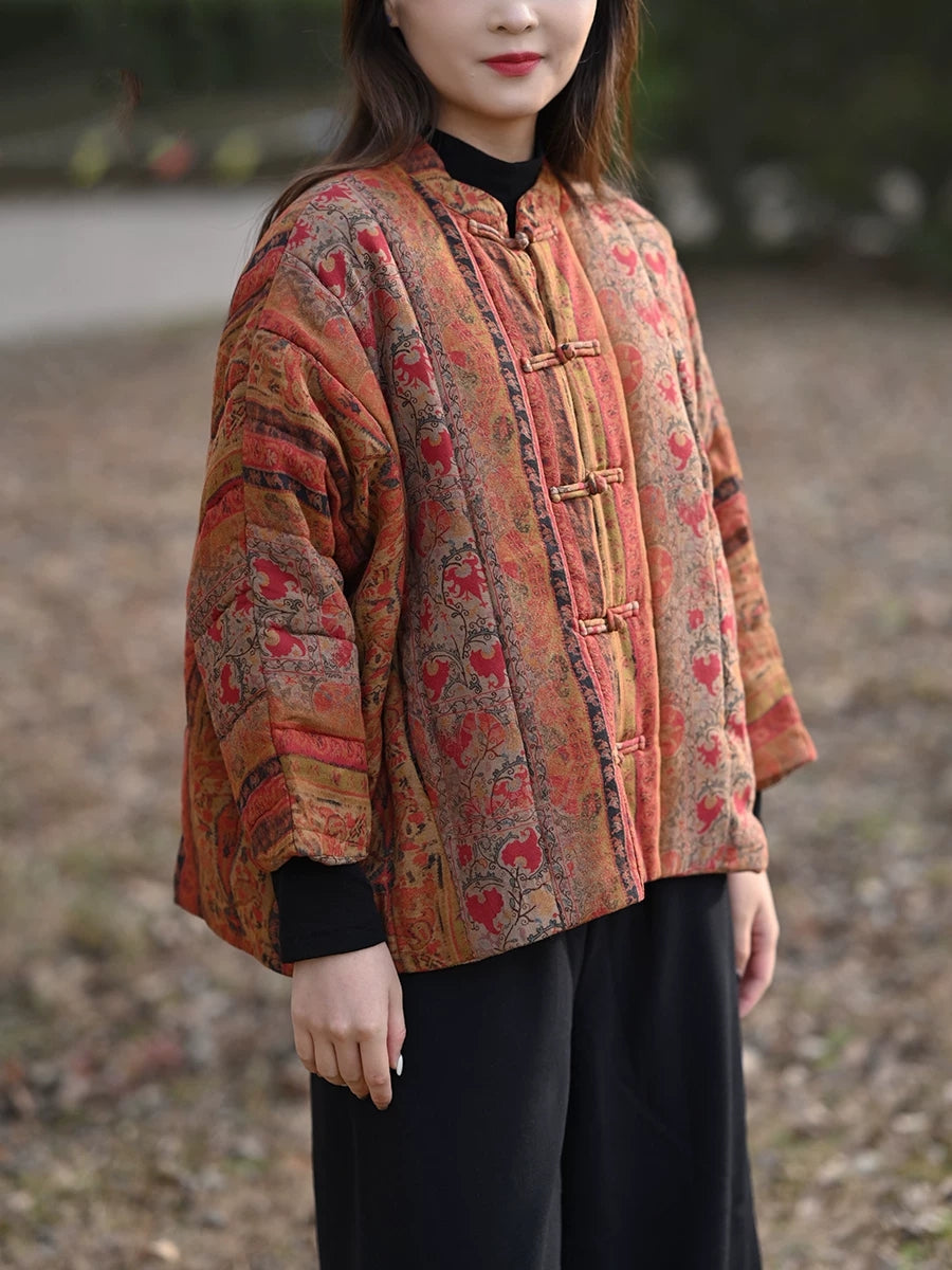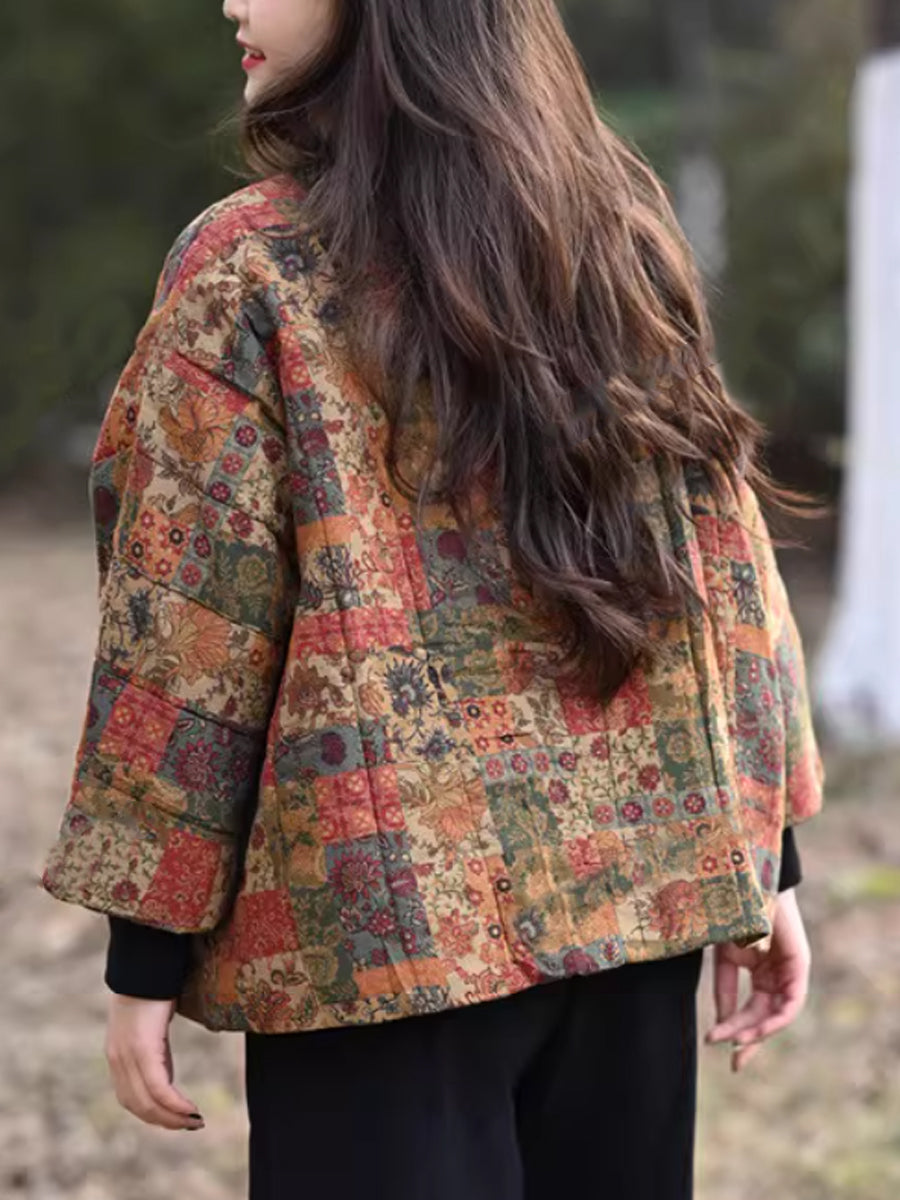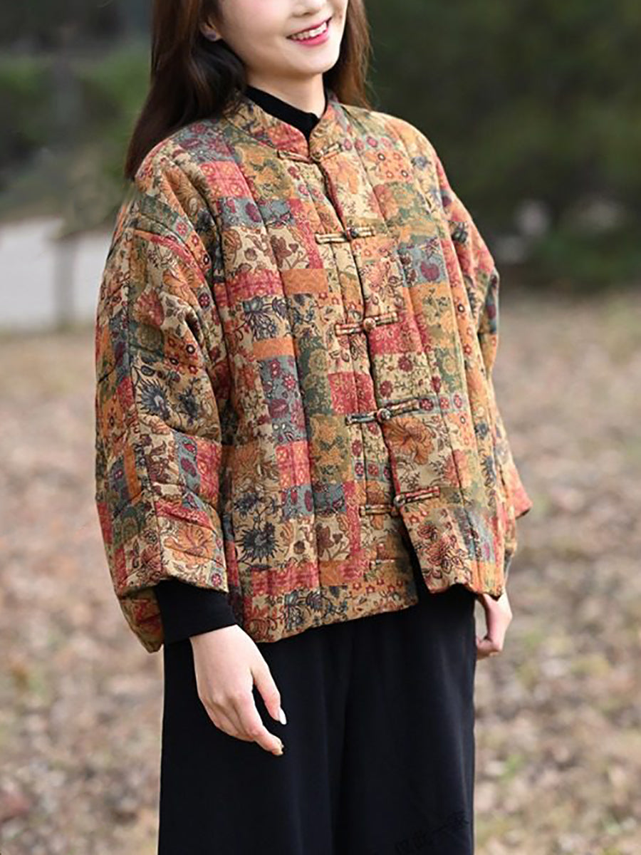 Women Winter Flower Patchwork Stand Collar Padded Coat