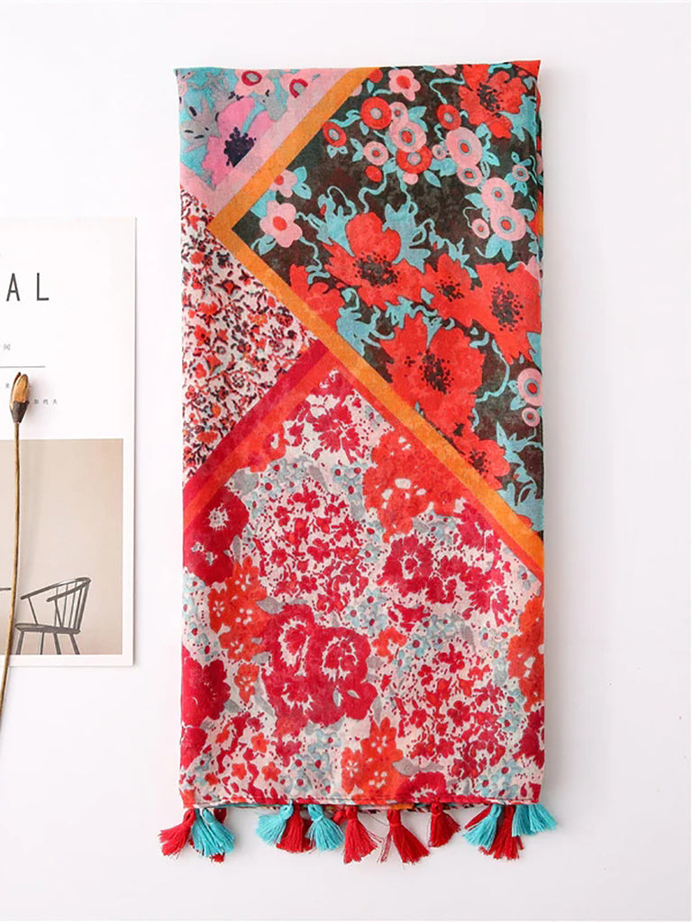 Women Ethnic Flower Spliced Tassel Shawl Scarf