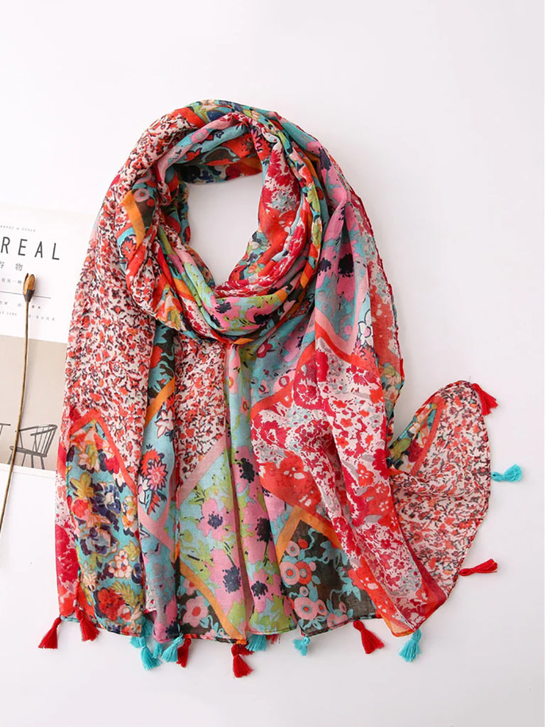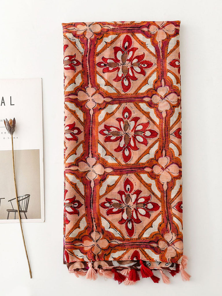 Women Ethnic Style Cotton Floral Tassel Scarf