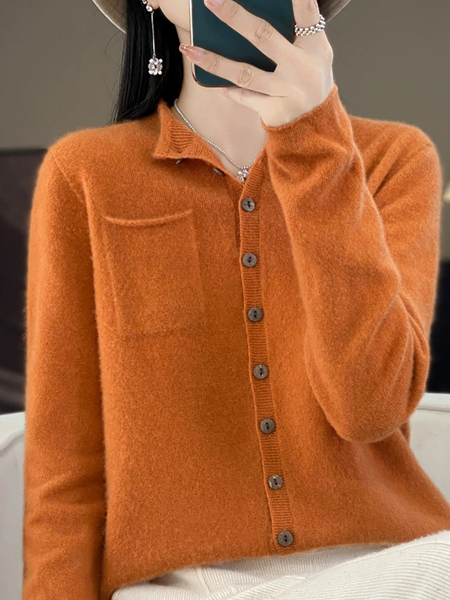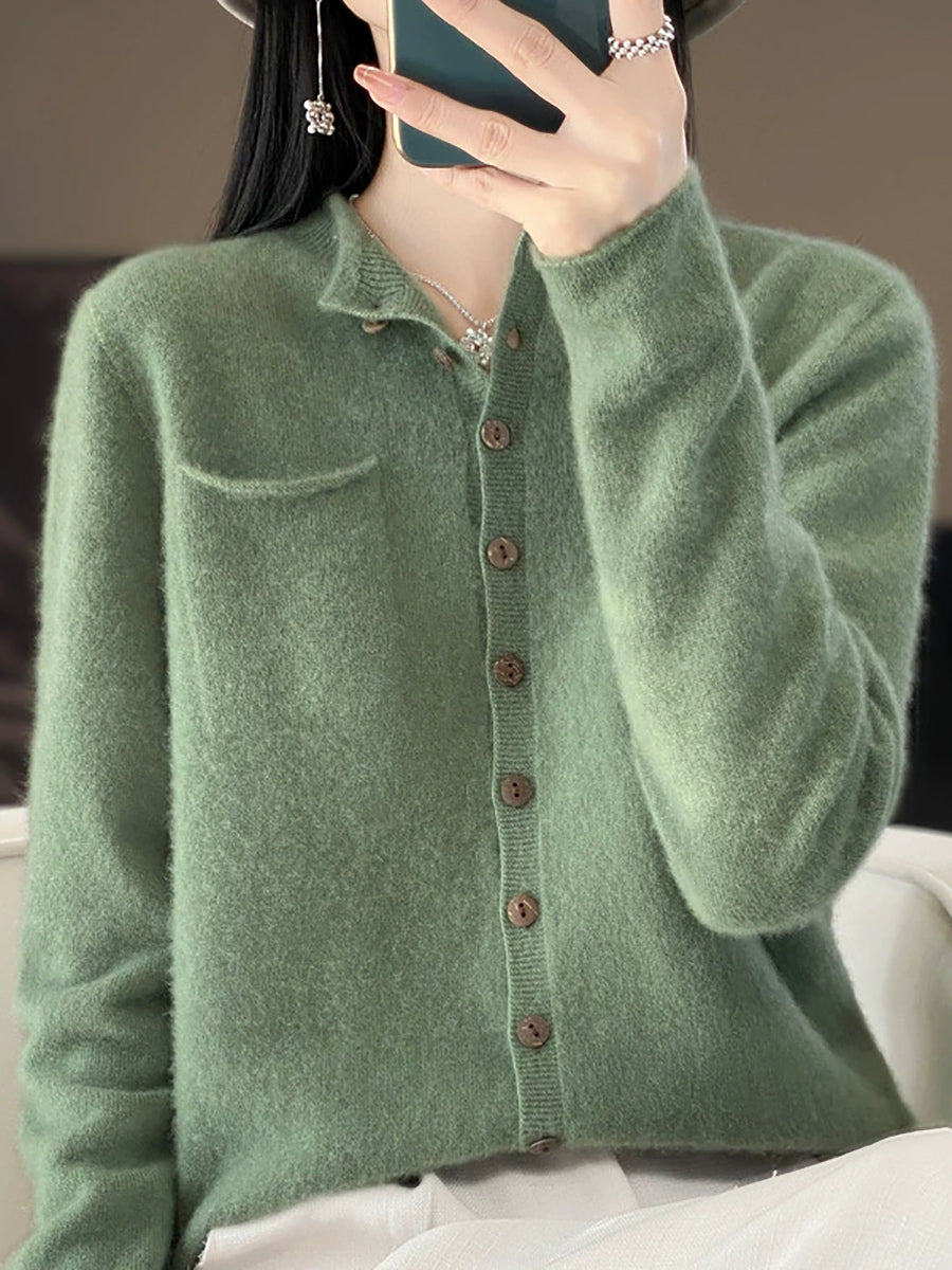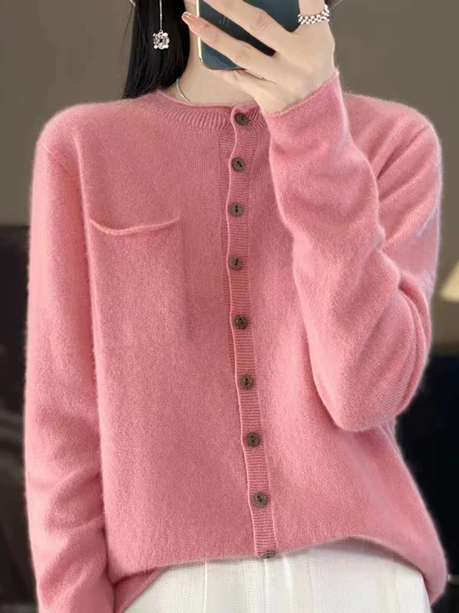 Women Spring Artsy Pure Color O-Neck Cardigan Sweater