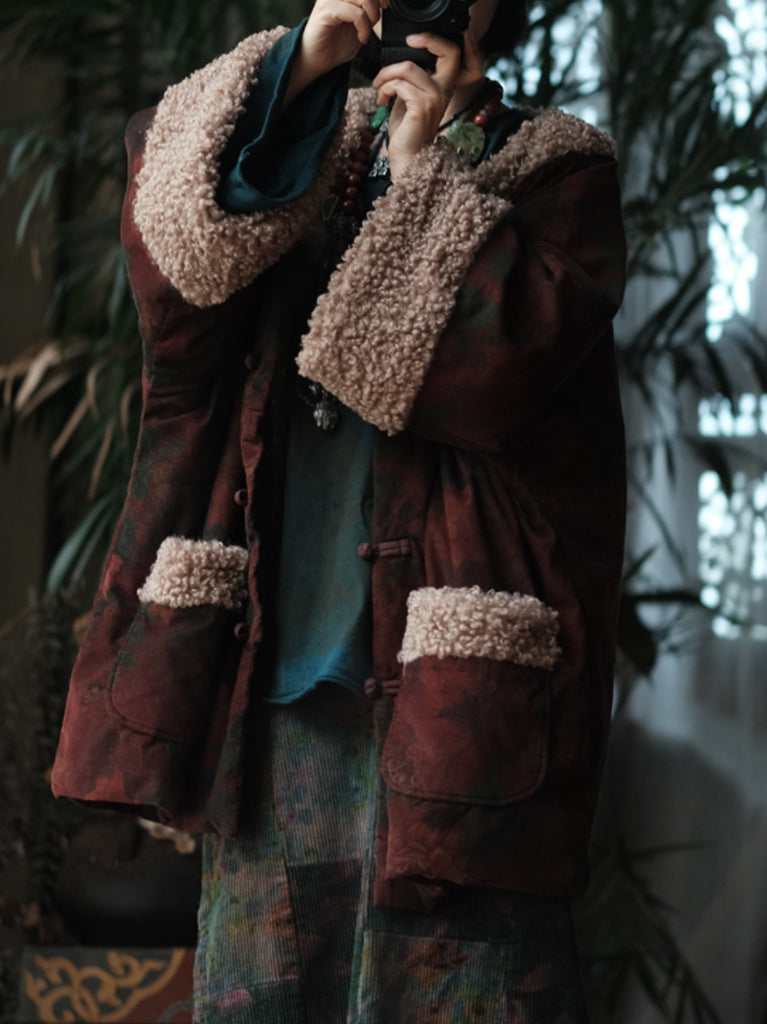 Women Vintage Winter Flower Fleece Spliced O-Neck Corduroy Coat
