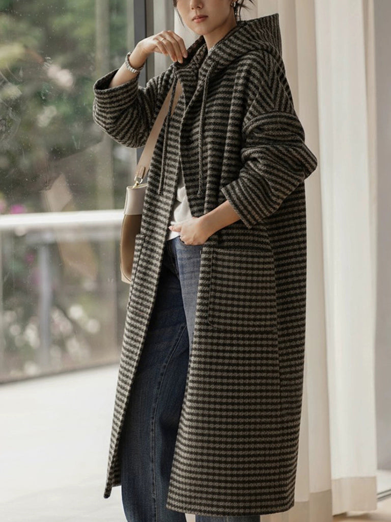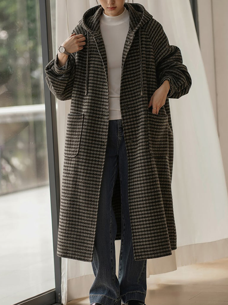 Plus Size Women Autumn Plaid Spliced Hooded Cotton Cardigan Coat