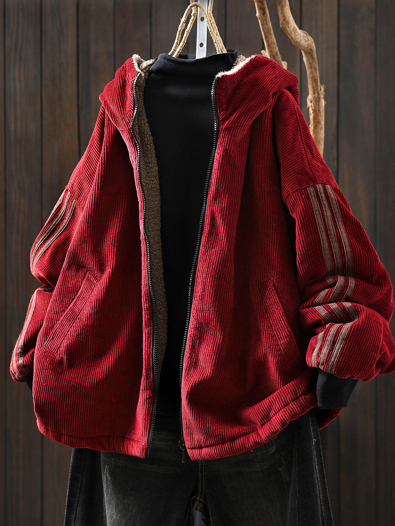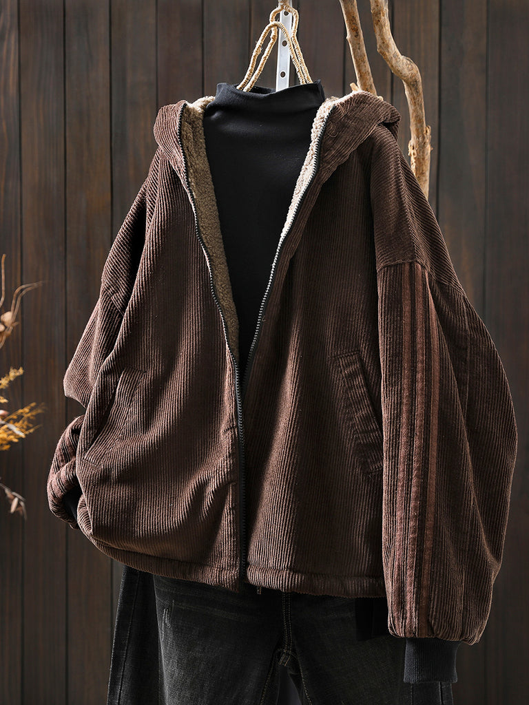 Plus Size Women Retro Autumn Pure Color Hooded Corduroy Coat