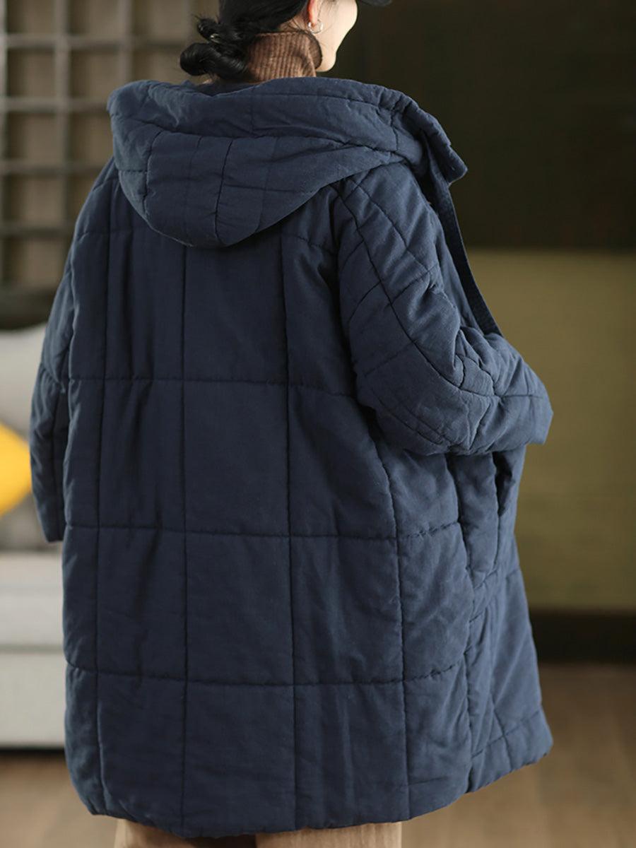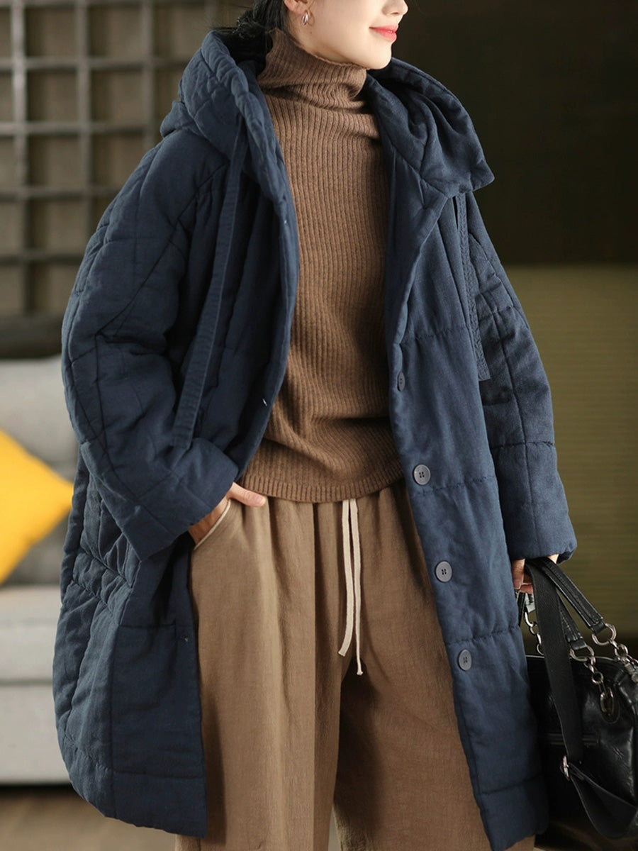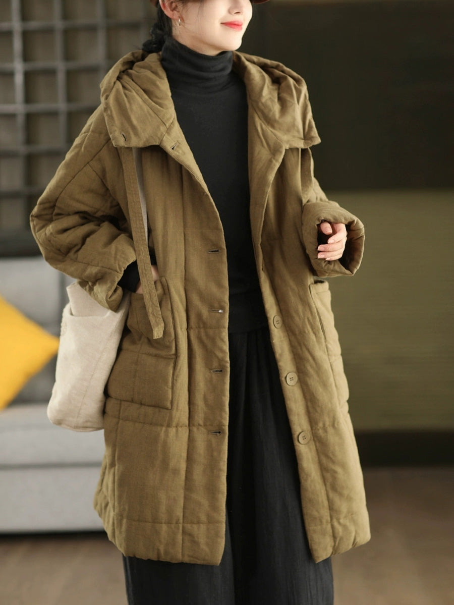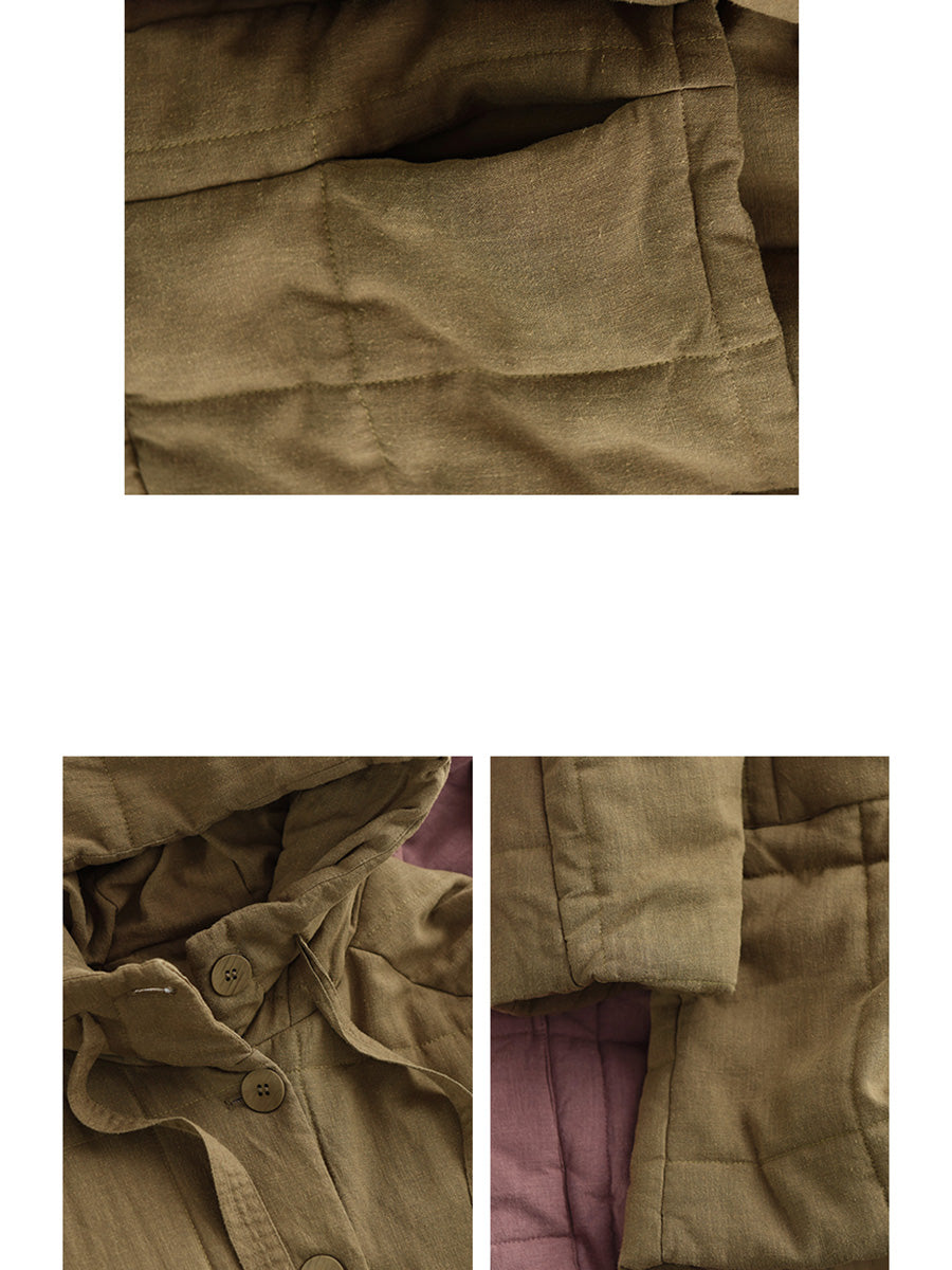 Women Winter Retro Ramie Hooded Padded Coat