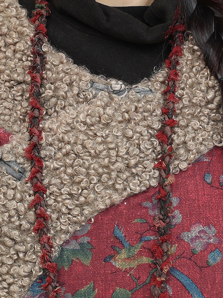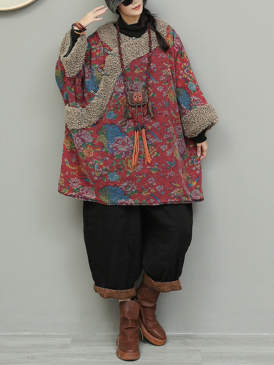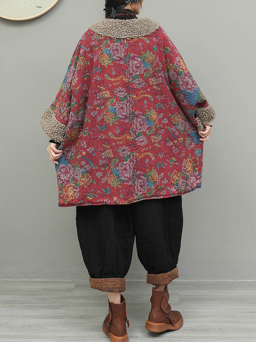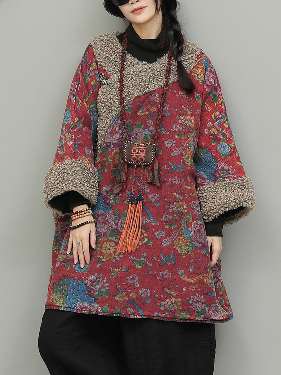Women Retro Flower Fleece Spliced Cotton O-Neck Coat