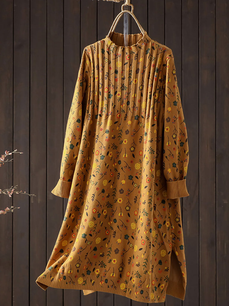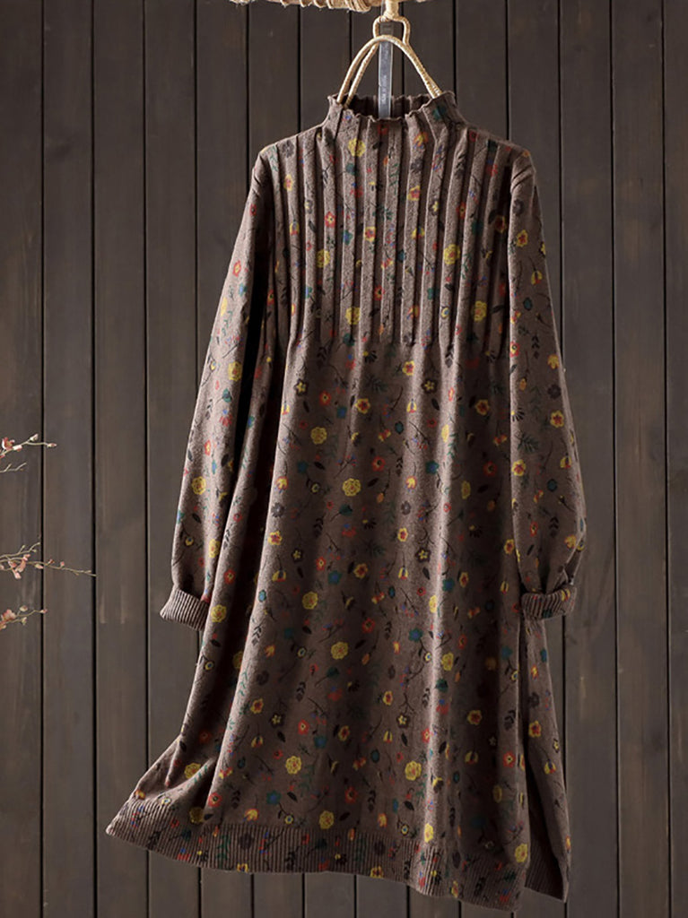 Women Autumn Vintage Floral Half-Turtleneck Knitted Dress