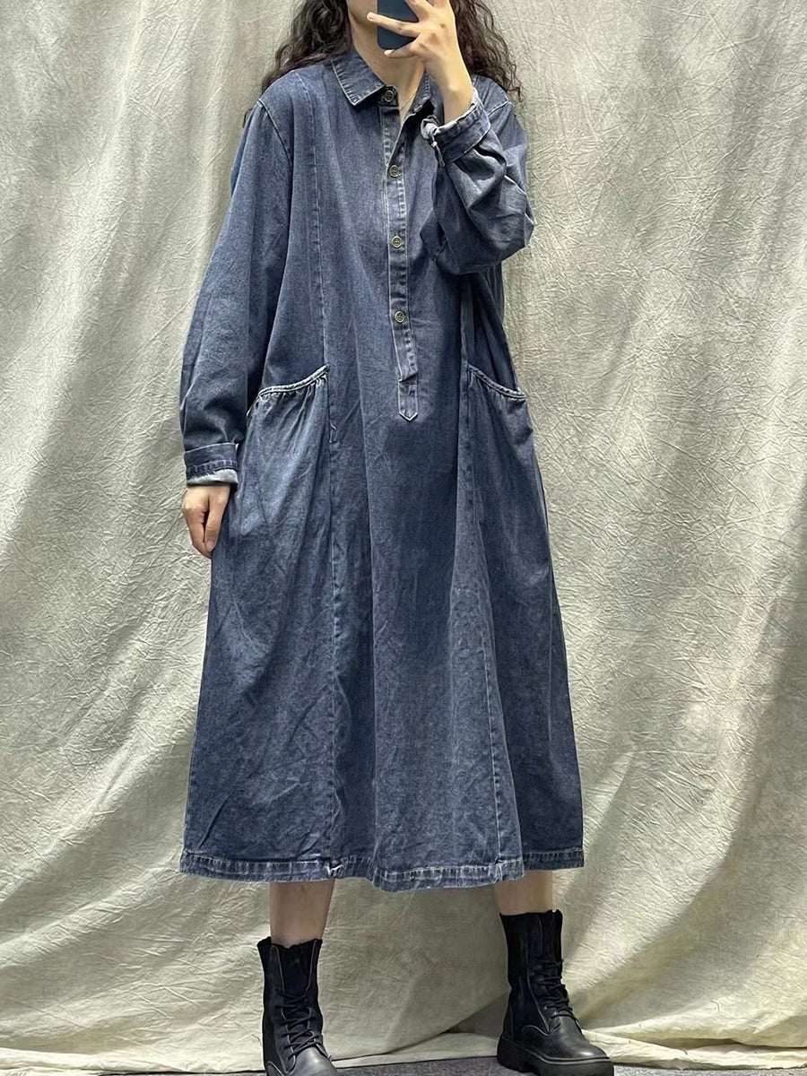 Plus Size Women Spring Retro Pocket Button Loose Denim Dress