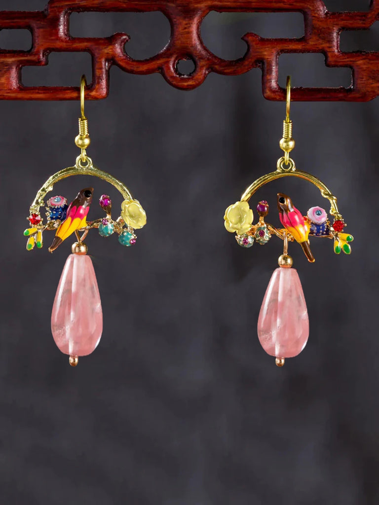 Bird And Flower Chalcedony Pendant Earrings