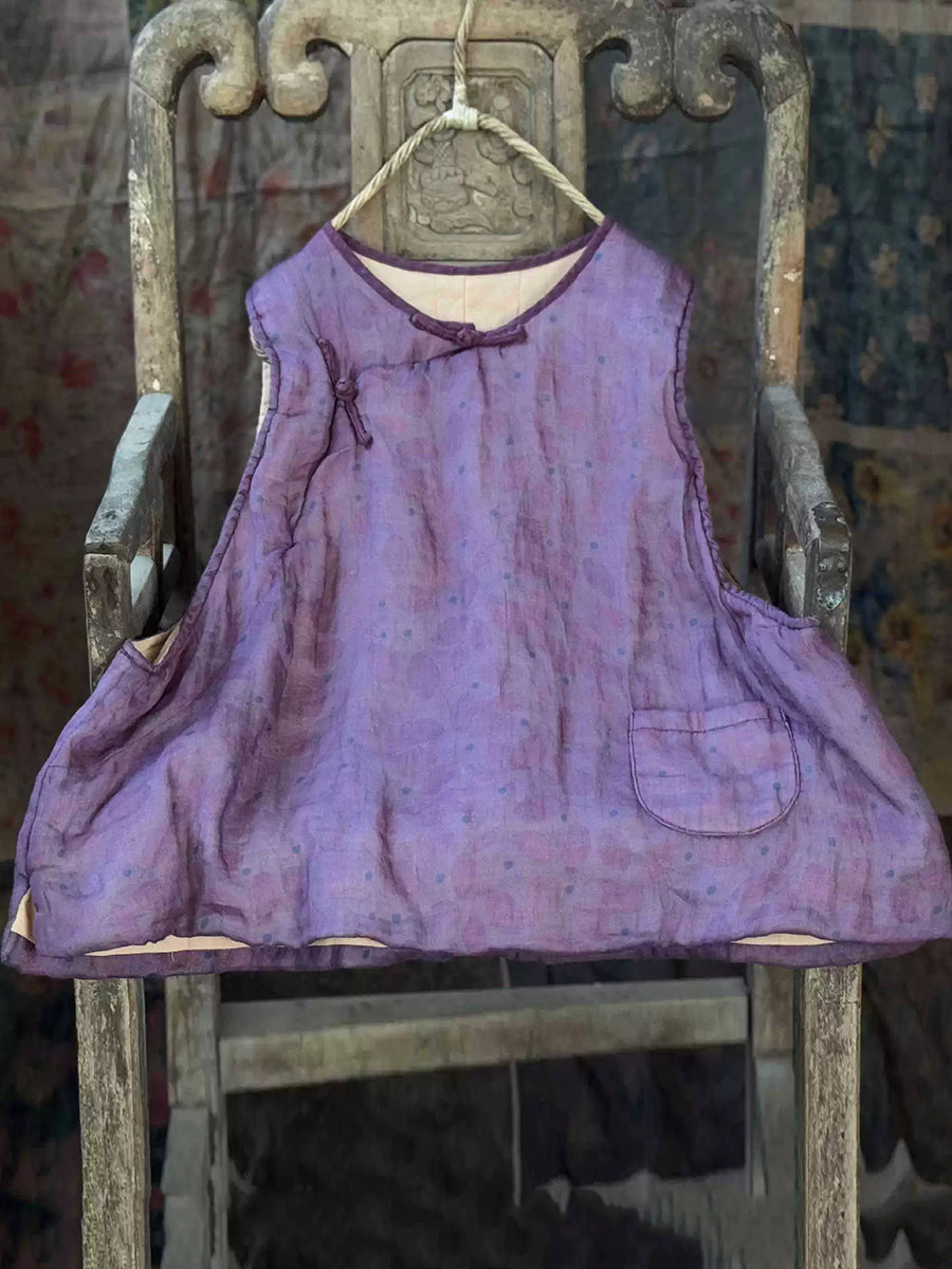 Women Winter Retro Flower O-Neck Ramie Padded Vest