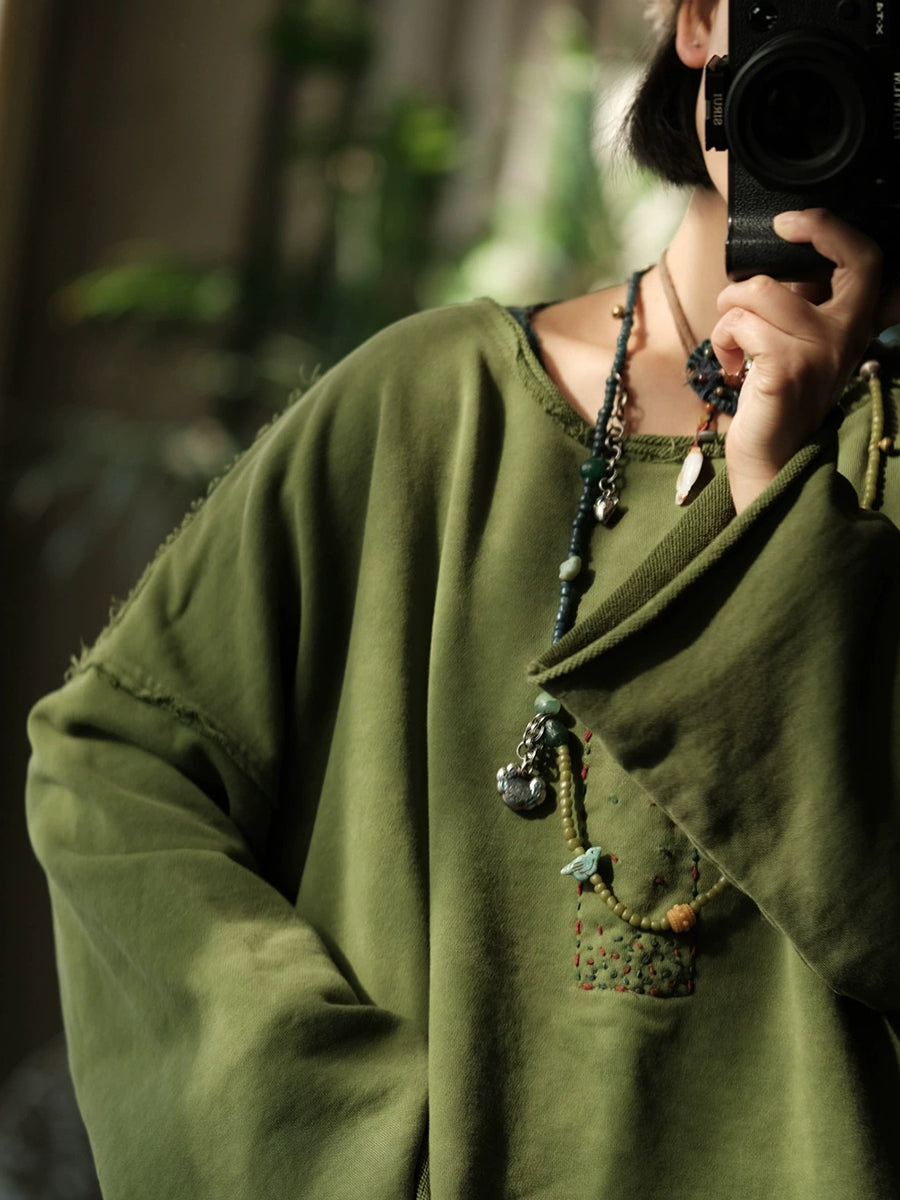 Women Winter Retro Pure Color Stitching O-Neck Blouse