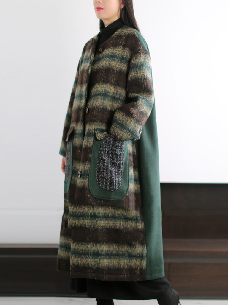 Women Vintage Winter Stripe Spliced Cocoon-shaped Woolen Overcoat