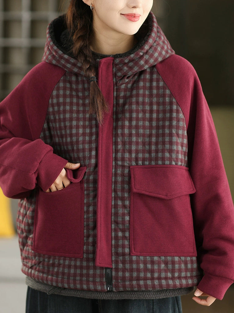Women Winter Plaid Dual-side Wearing Fleece-lined Hooded Coat