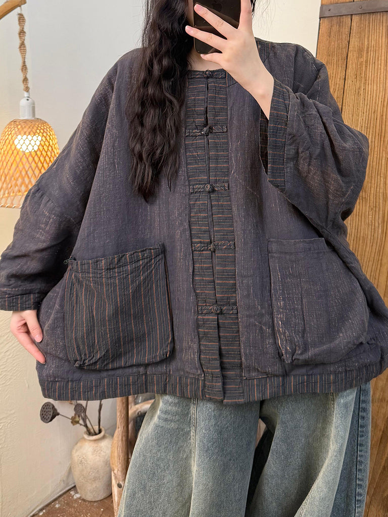 Women Vintage Winter Stripe Spliced O-Neck Padded Coat