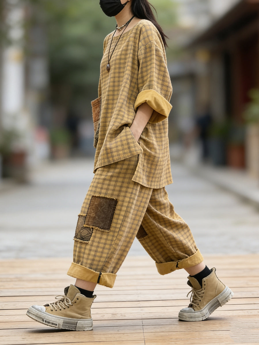 Women Spring Retro Plaid Patchwork Suits
