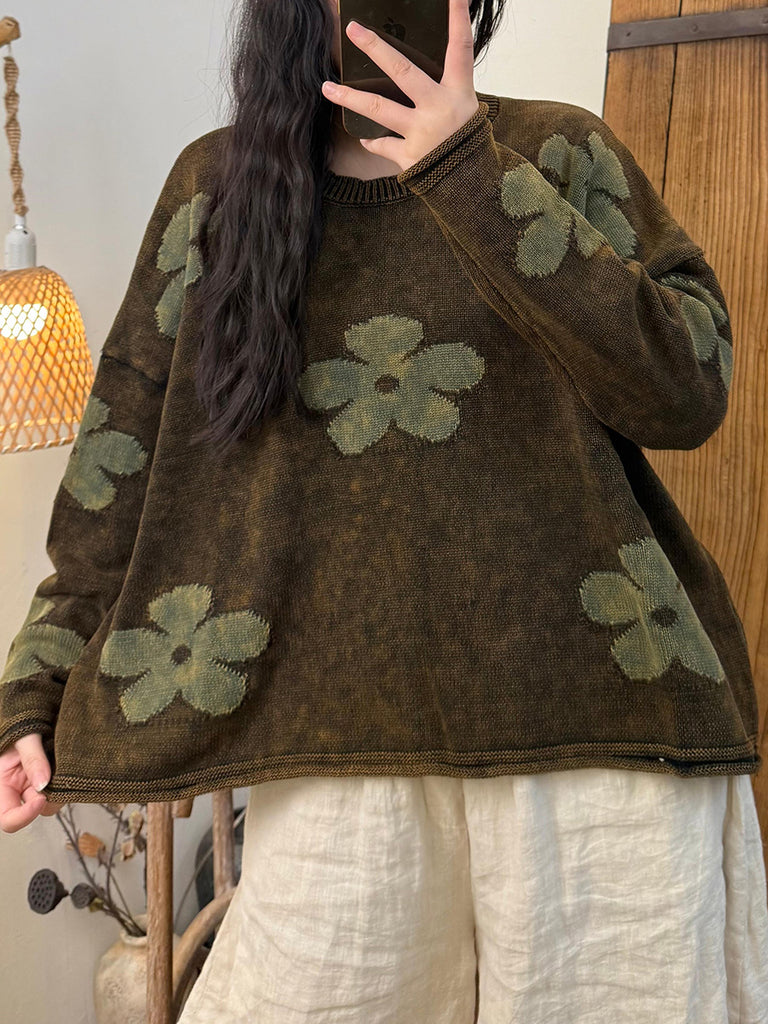 Women Autumn Retro Flower Stripe V-Neck Knitted Sweater