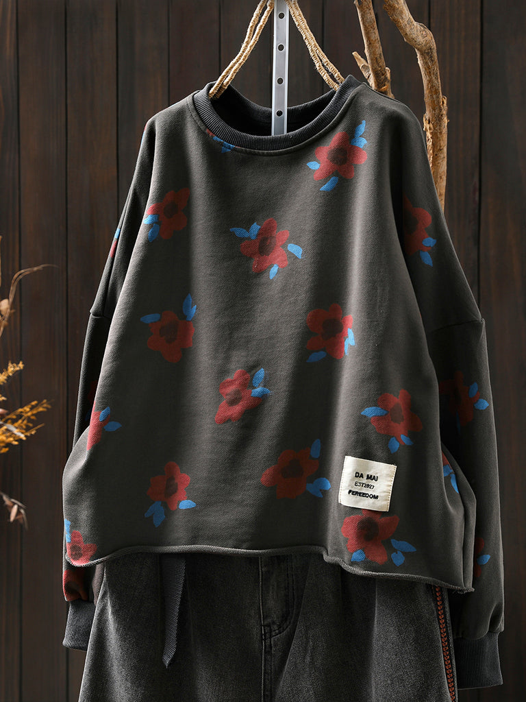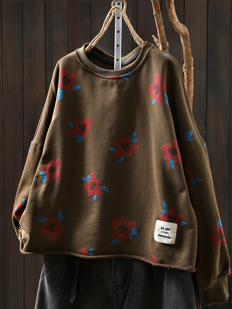 Women Autumn Artsy Flower O-Neck Cotton Blouse