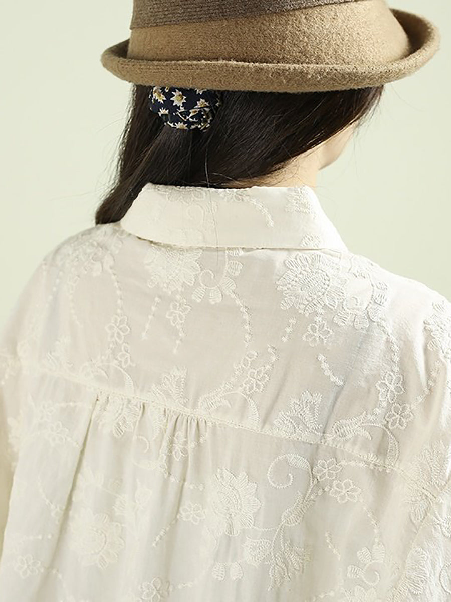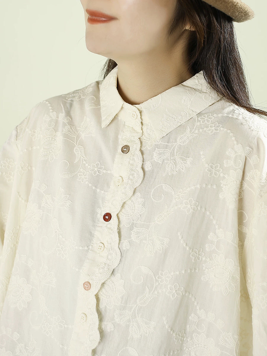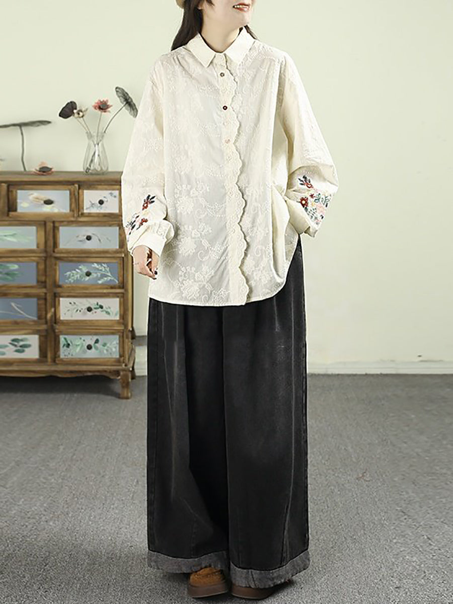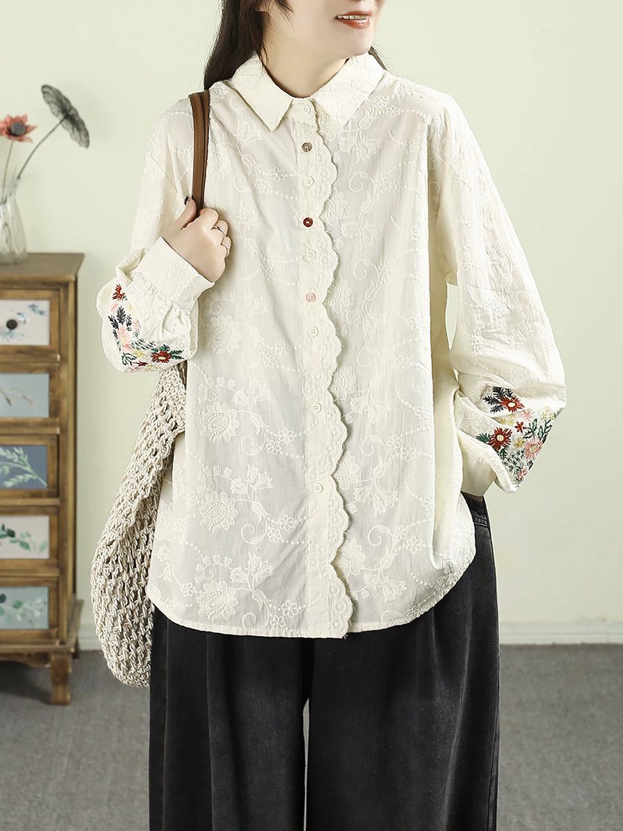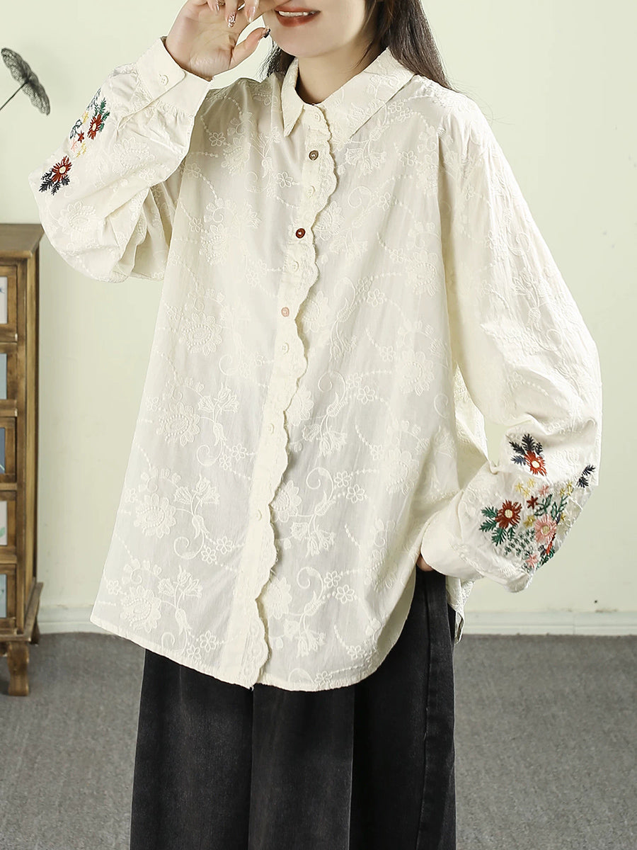 Women Artsy Autumn Embroidery 100%Cotton Shirt