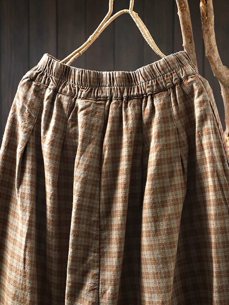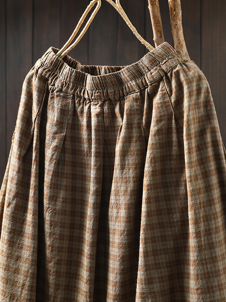 Women Autumn Plaid A-Shape Lace Spliced 100%Cotton Skirt