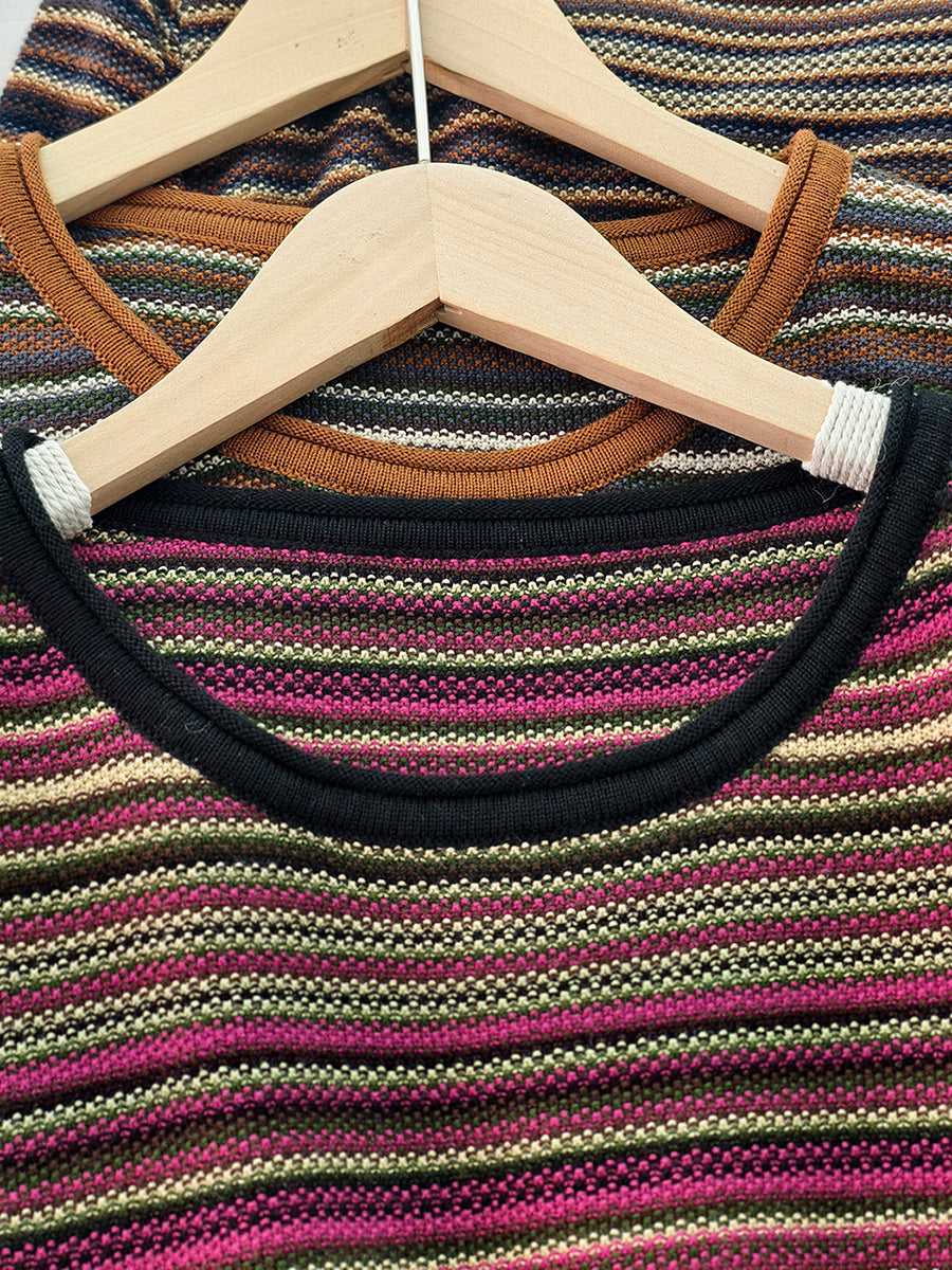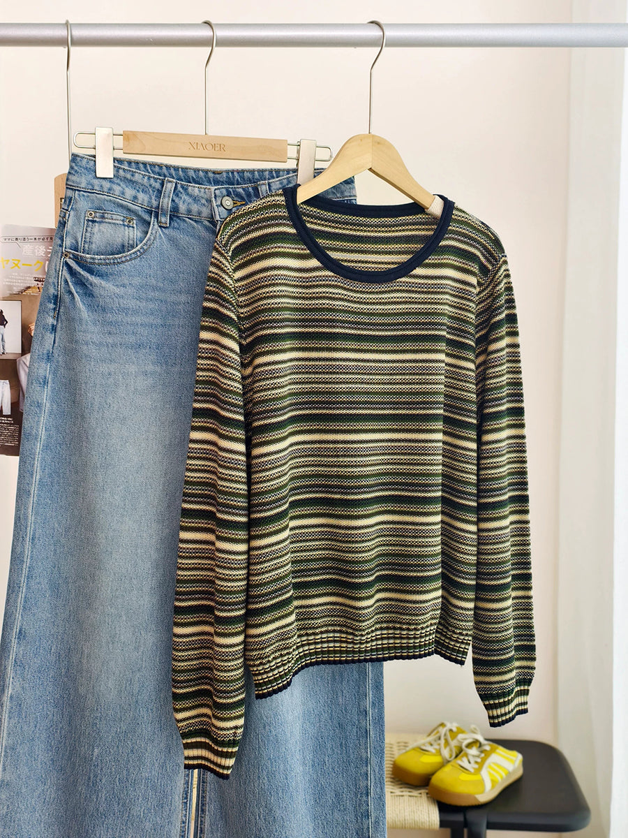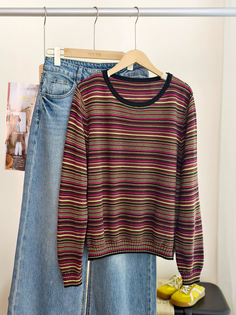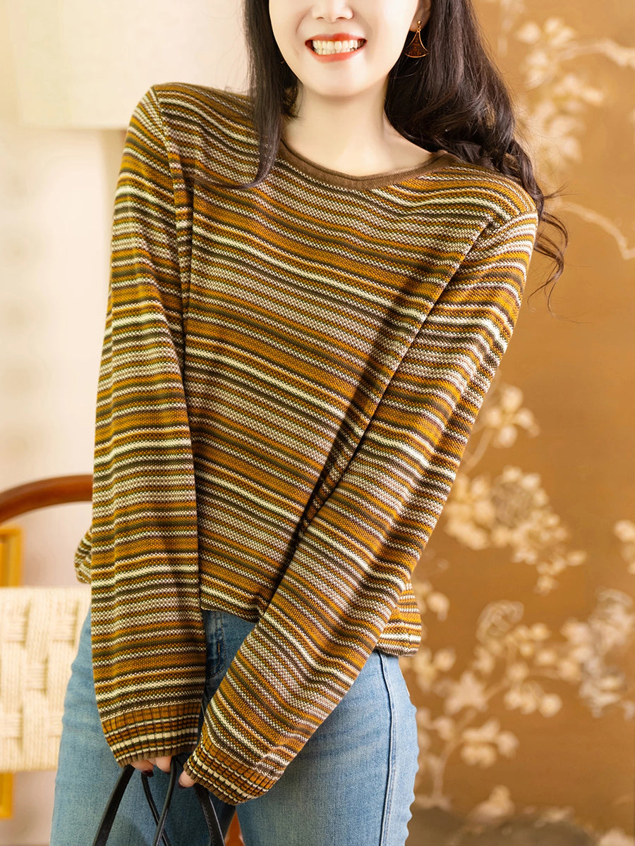 Women Spring Casual Stripe Cotton O-Neck Blouse