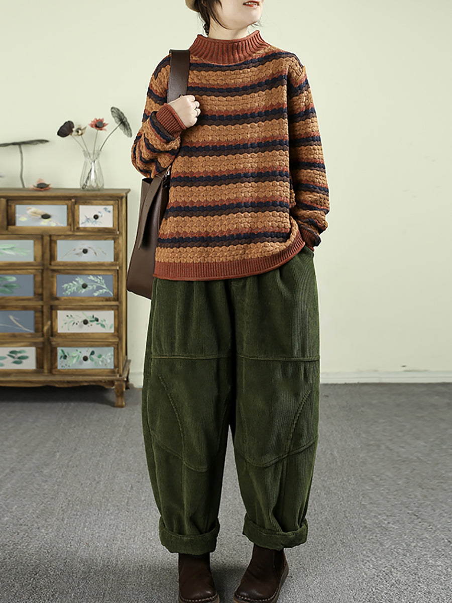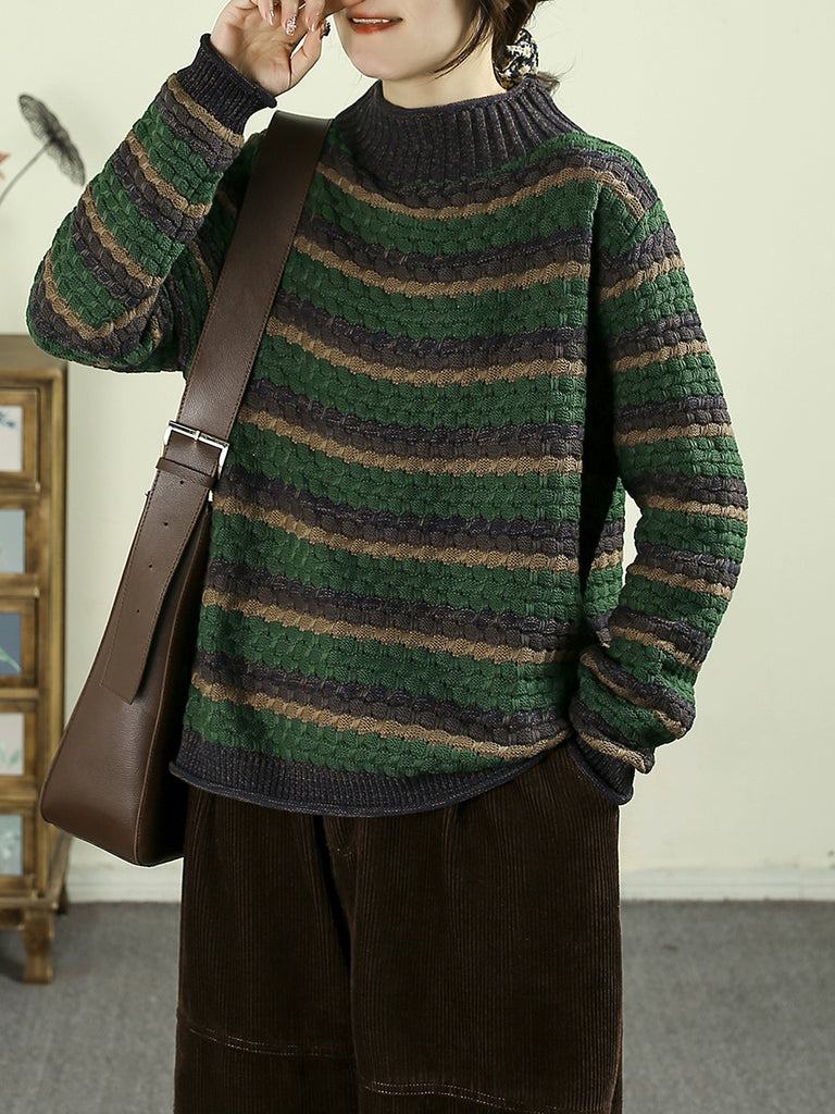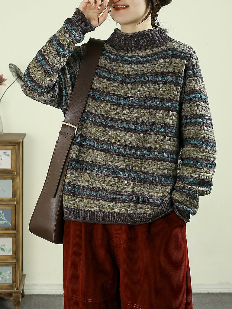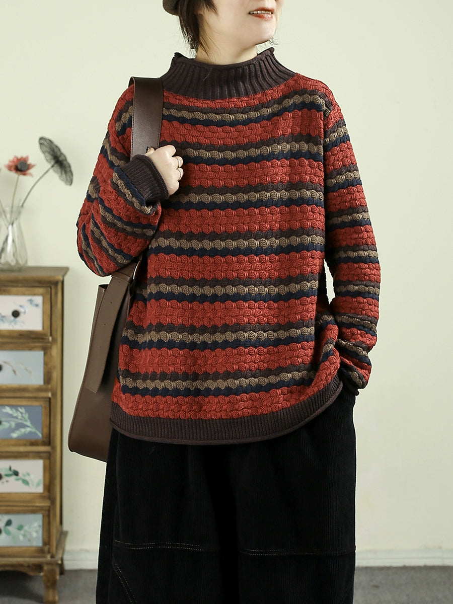 Women Autumn Artsy Stripe Knitted Half-Turtleneck Sweater
