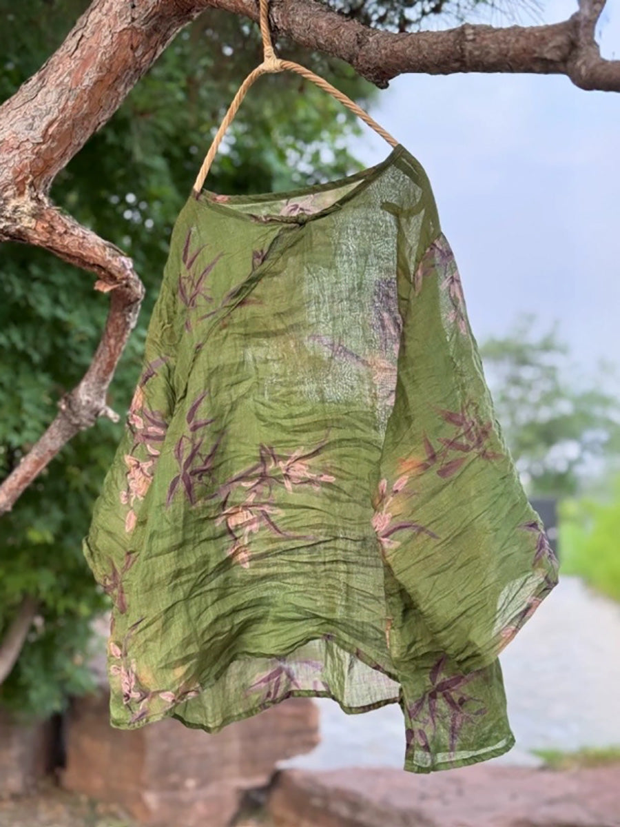 Women Summer Ethnic Flower Ramie O-Neck Shirt