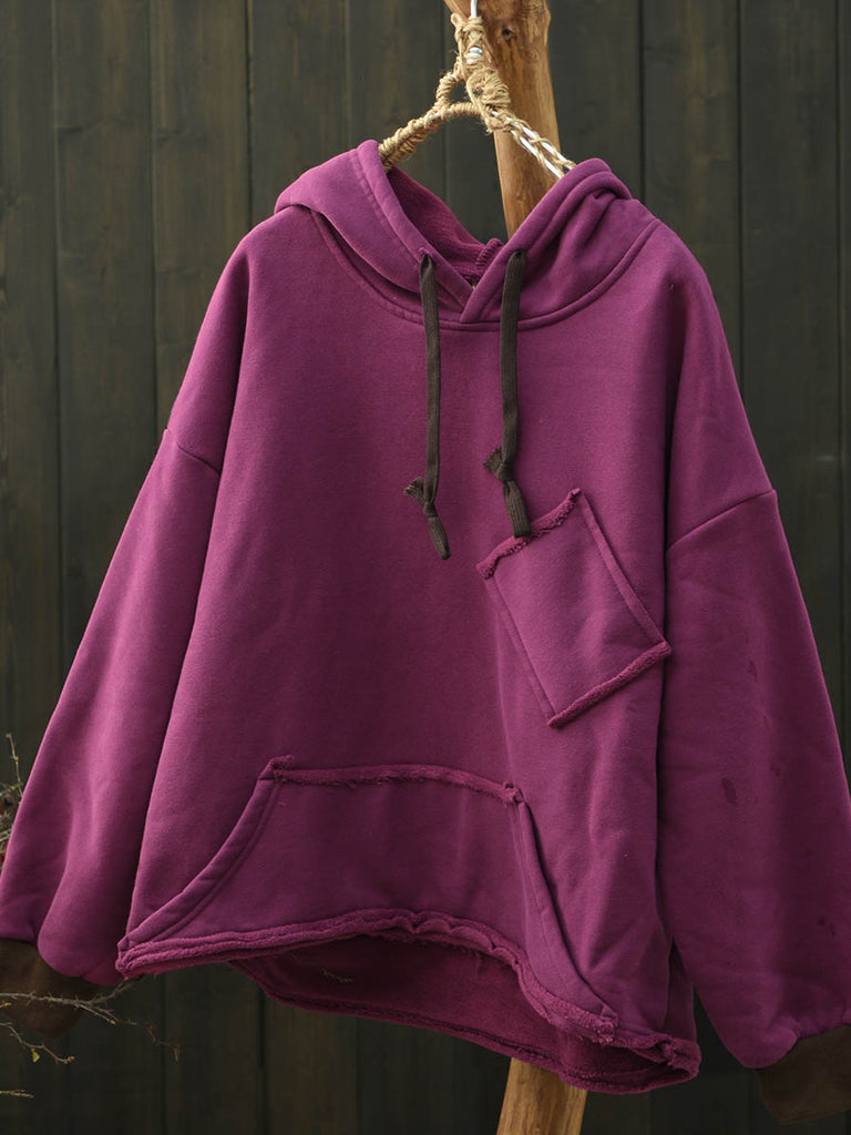 Women Winter Casual Pure Color Fleece-lined Hooded Blouse