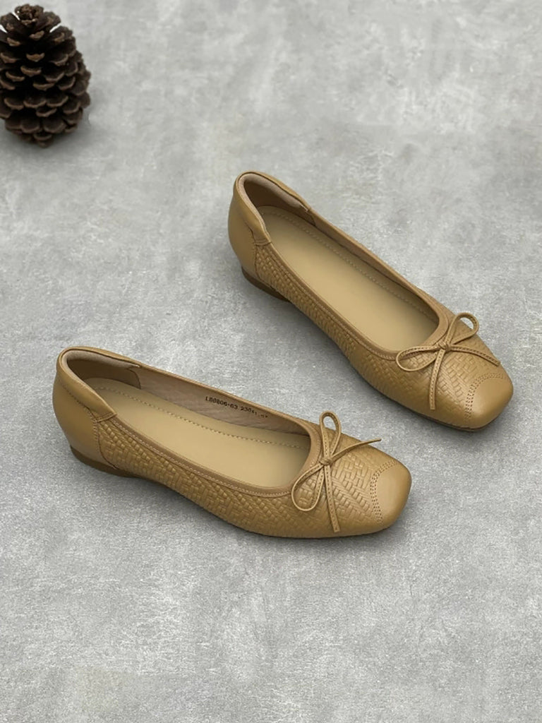 Women Elegant Leather Bowknot Square-Toe Low Heel Shoes