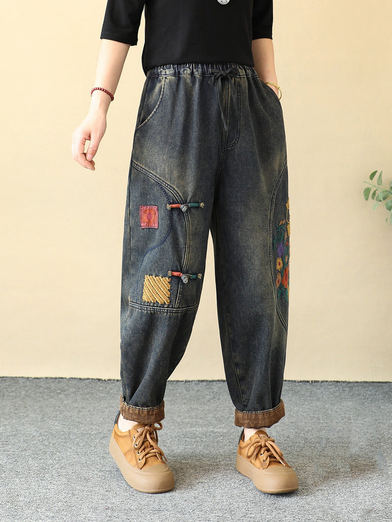 Women Winter Flower Embroidery Fleece-lined Harem Pants