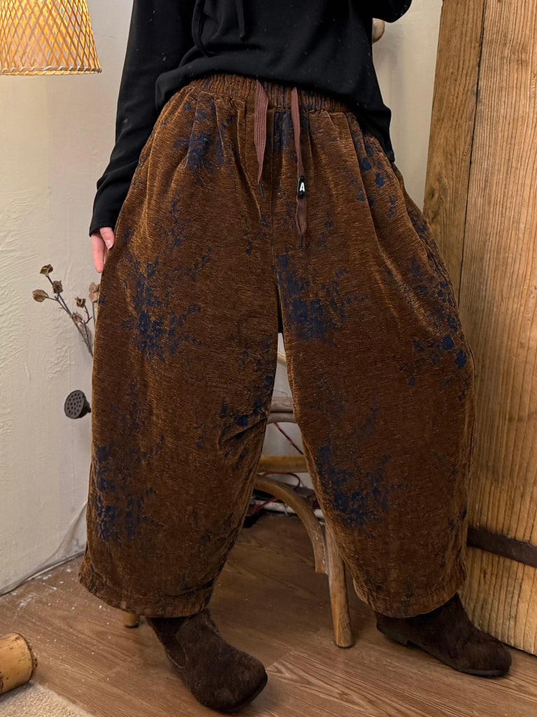 Women Winter Retro Flower Fleece-lined Straight Pants