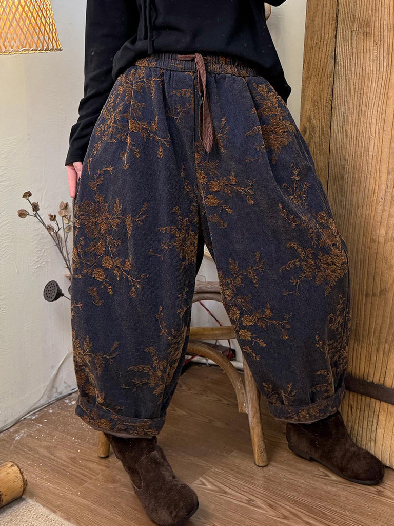 Women Winter Retro Corduroy Flower Spliced Harem Pants