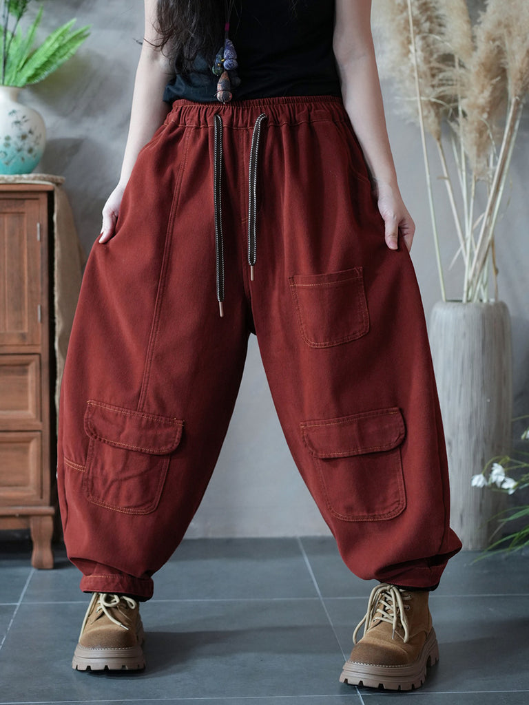 Women Winter Retro Pure Color 100%Cotton Harem Pants