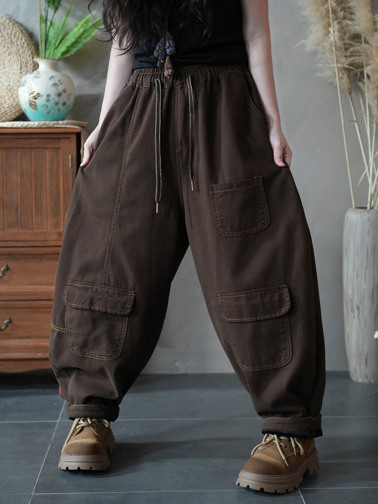 Women Winter Retro Pure Color Fleece-lined Harem Pants