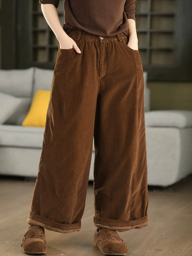 Women Winter Retro Pure Color Corduroy Wide-leg Pants