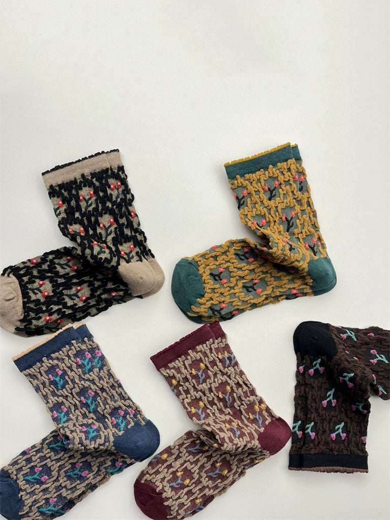 5 Pairs Vintage Flower Tube Preppy Style Warm Cotton Socks