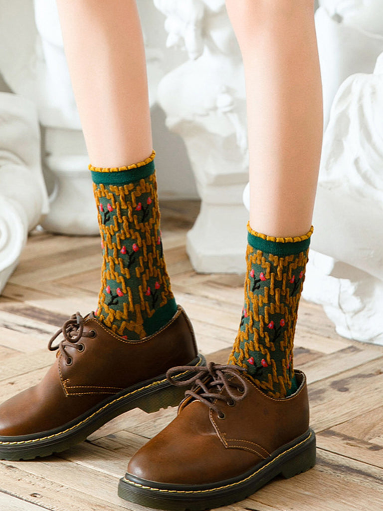 5 Pairs Spring Autumn National Vintage Artsy Jacquard Socks