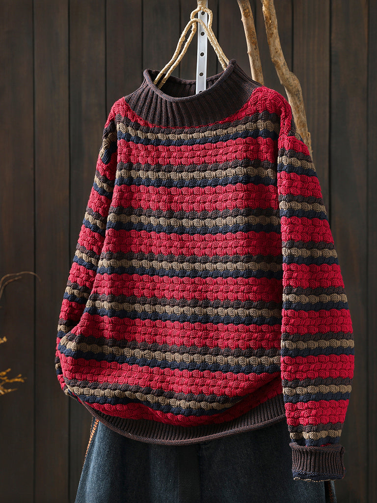 Women Autumn Artsy Stripe Half-Turtleneck Sweater