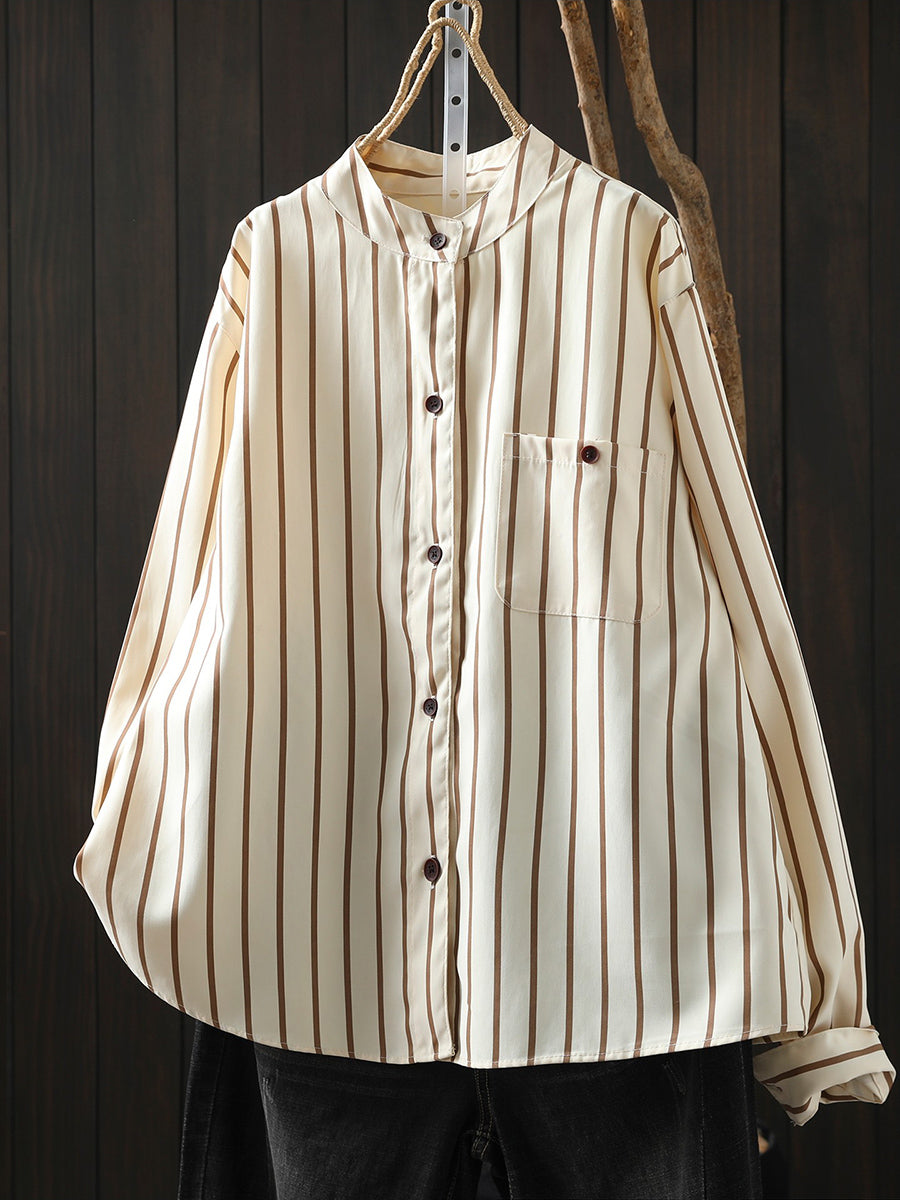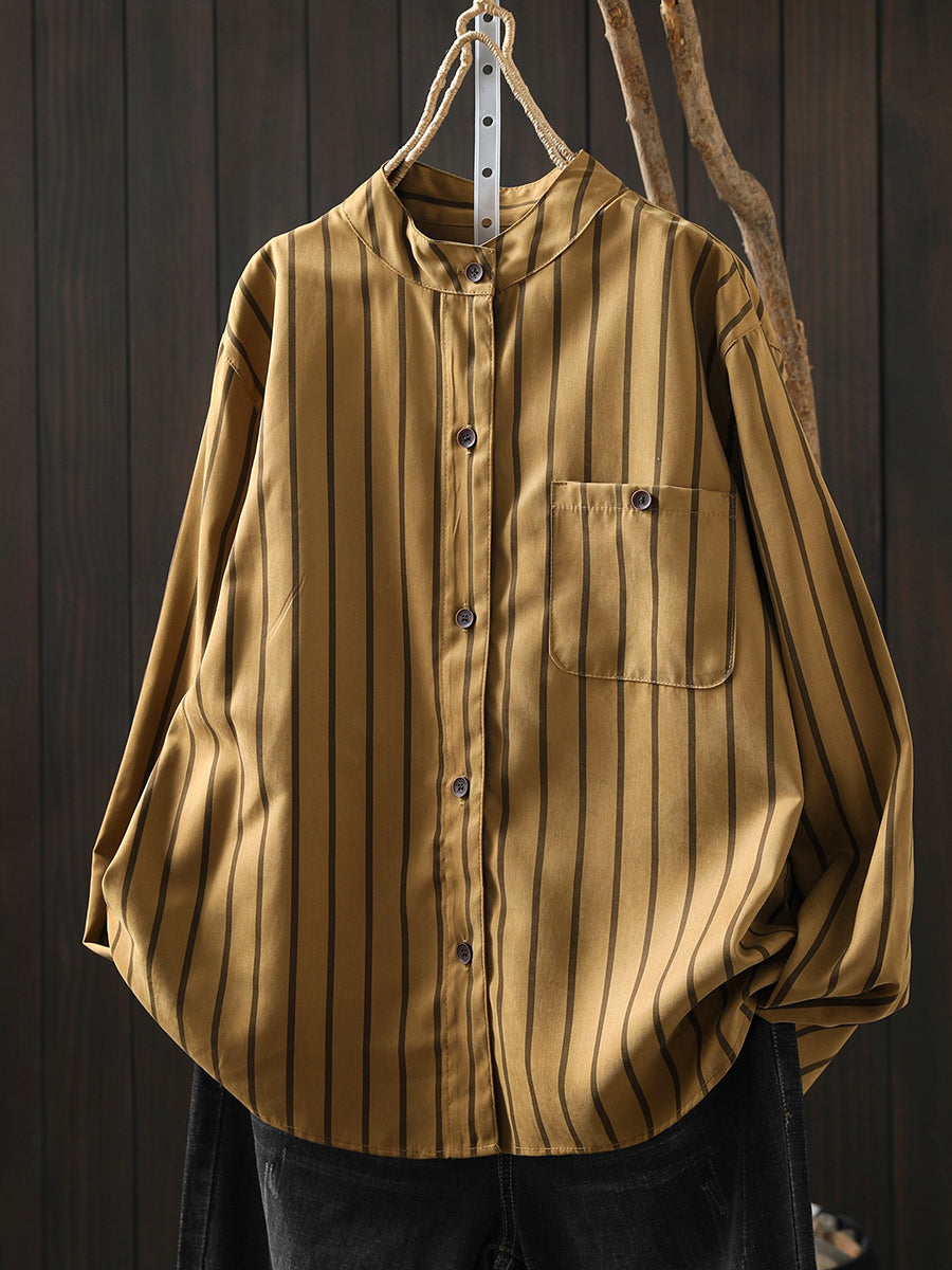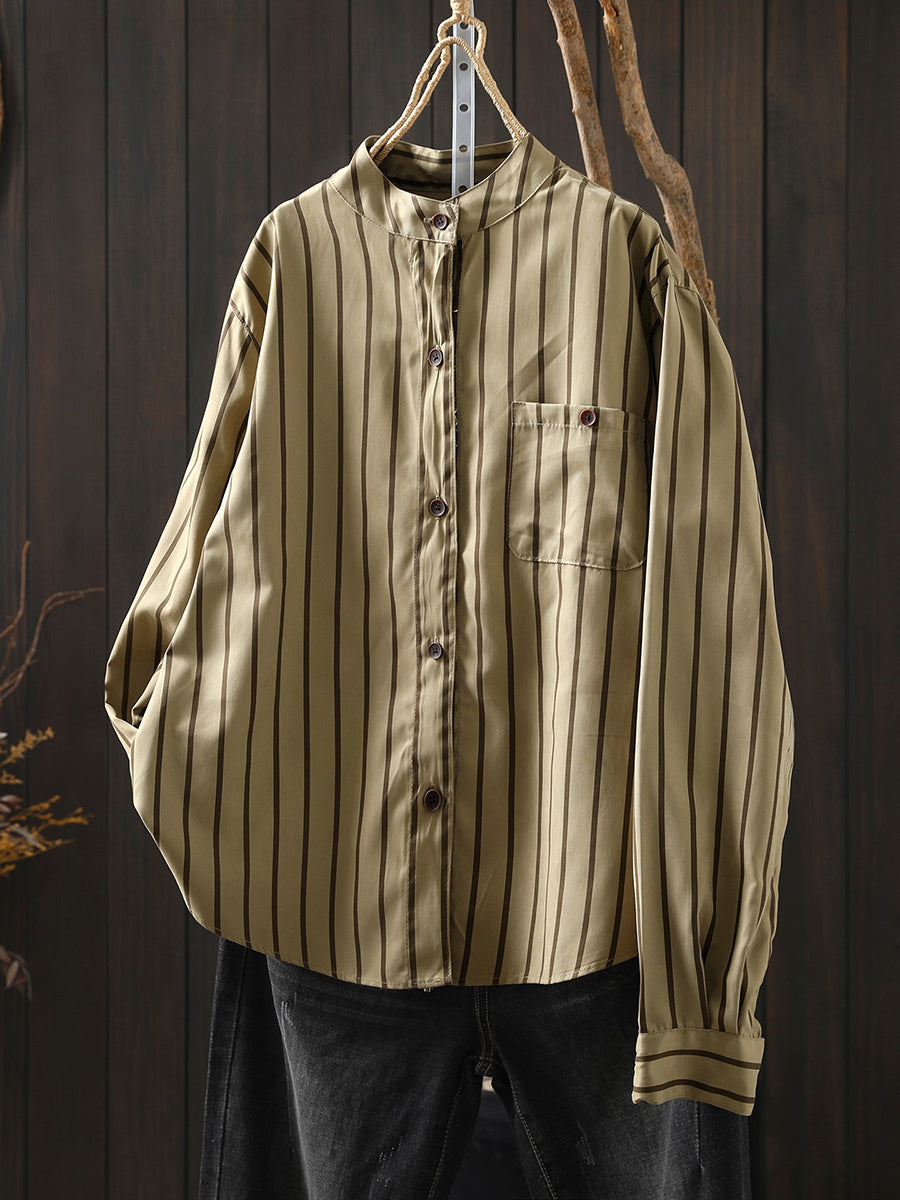Women Artsy Spring Stripe Stand Collar Cotton Shirt
