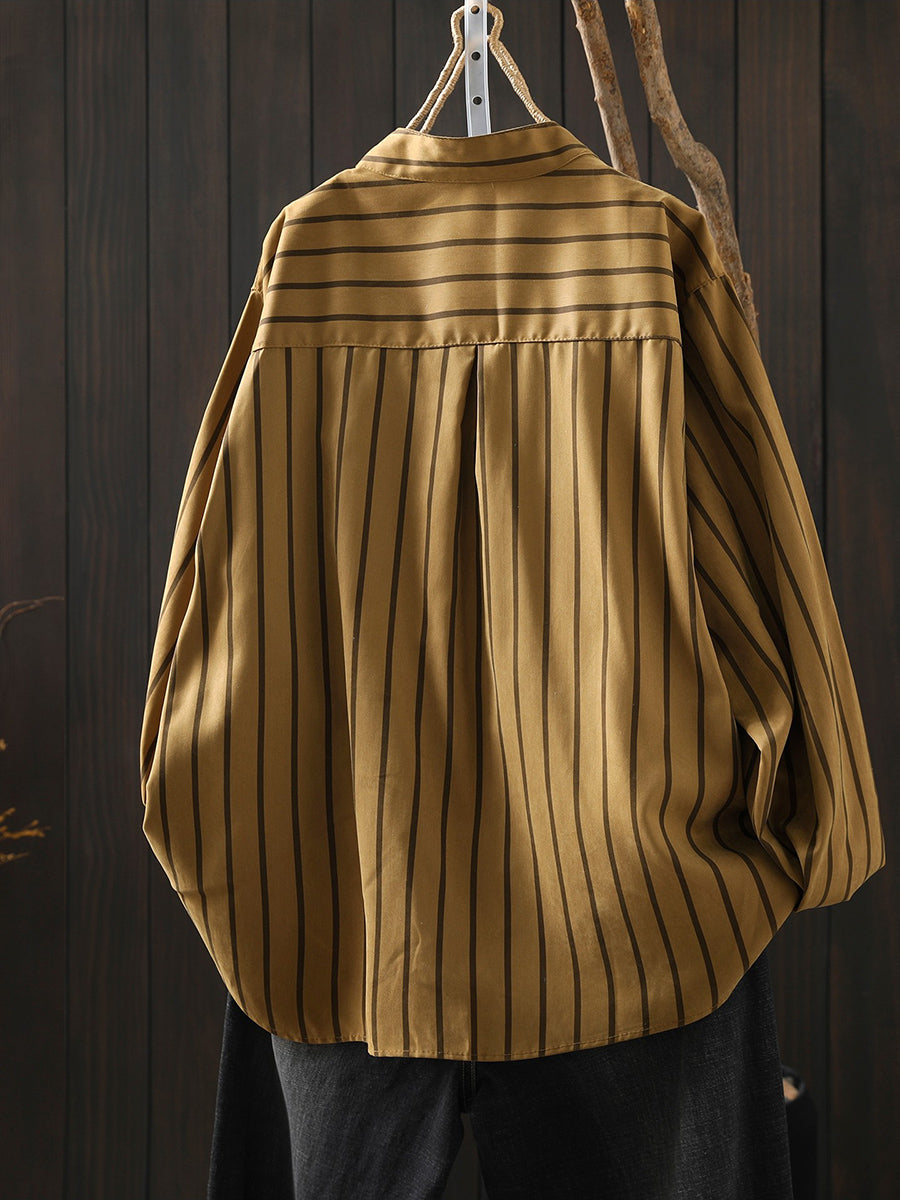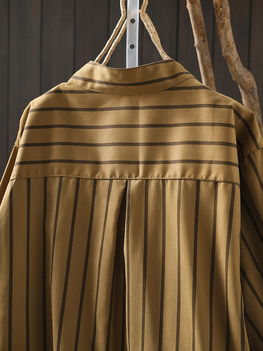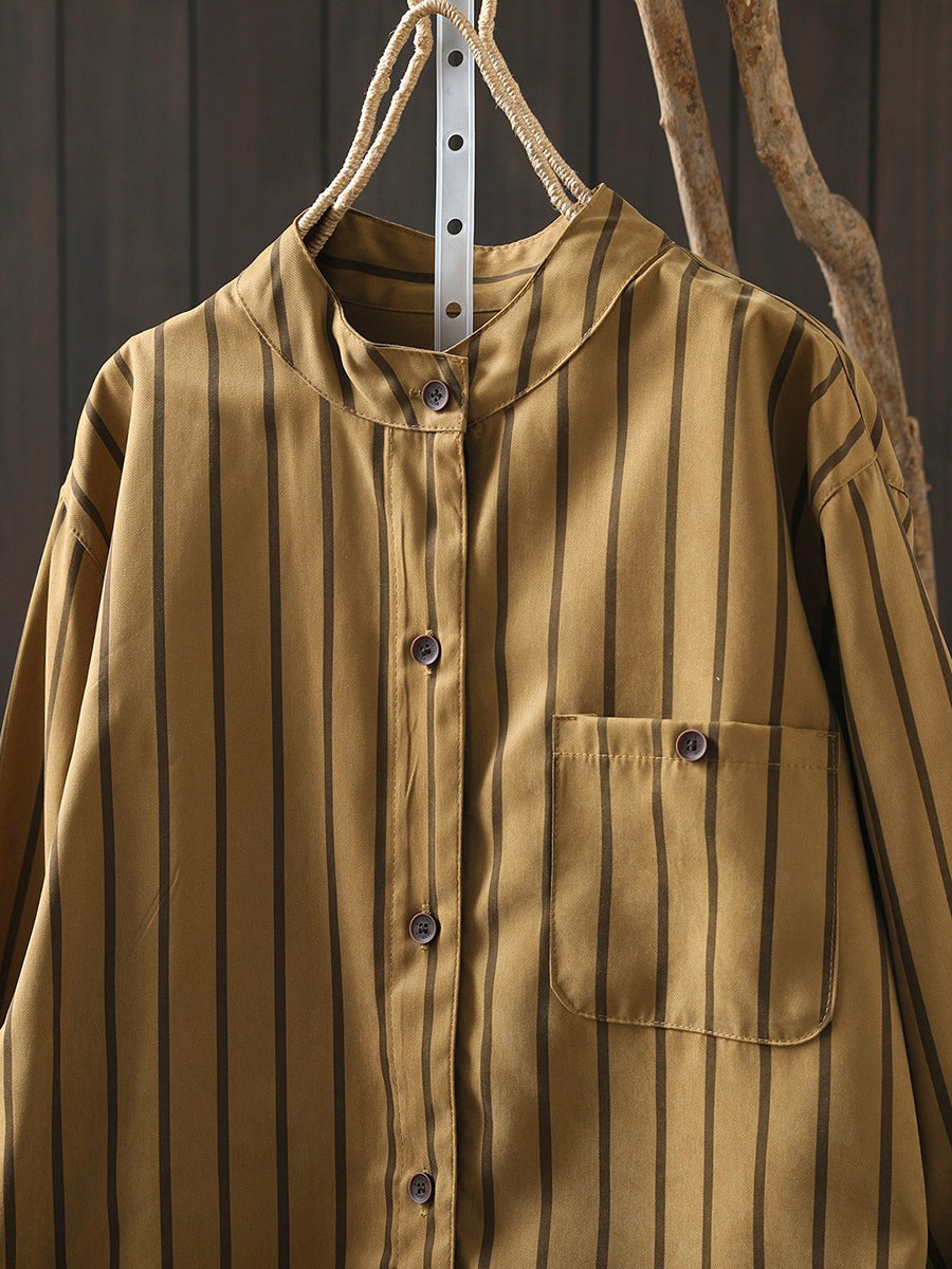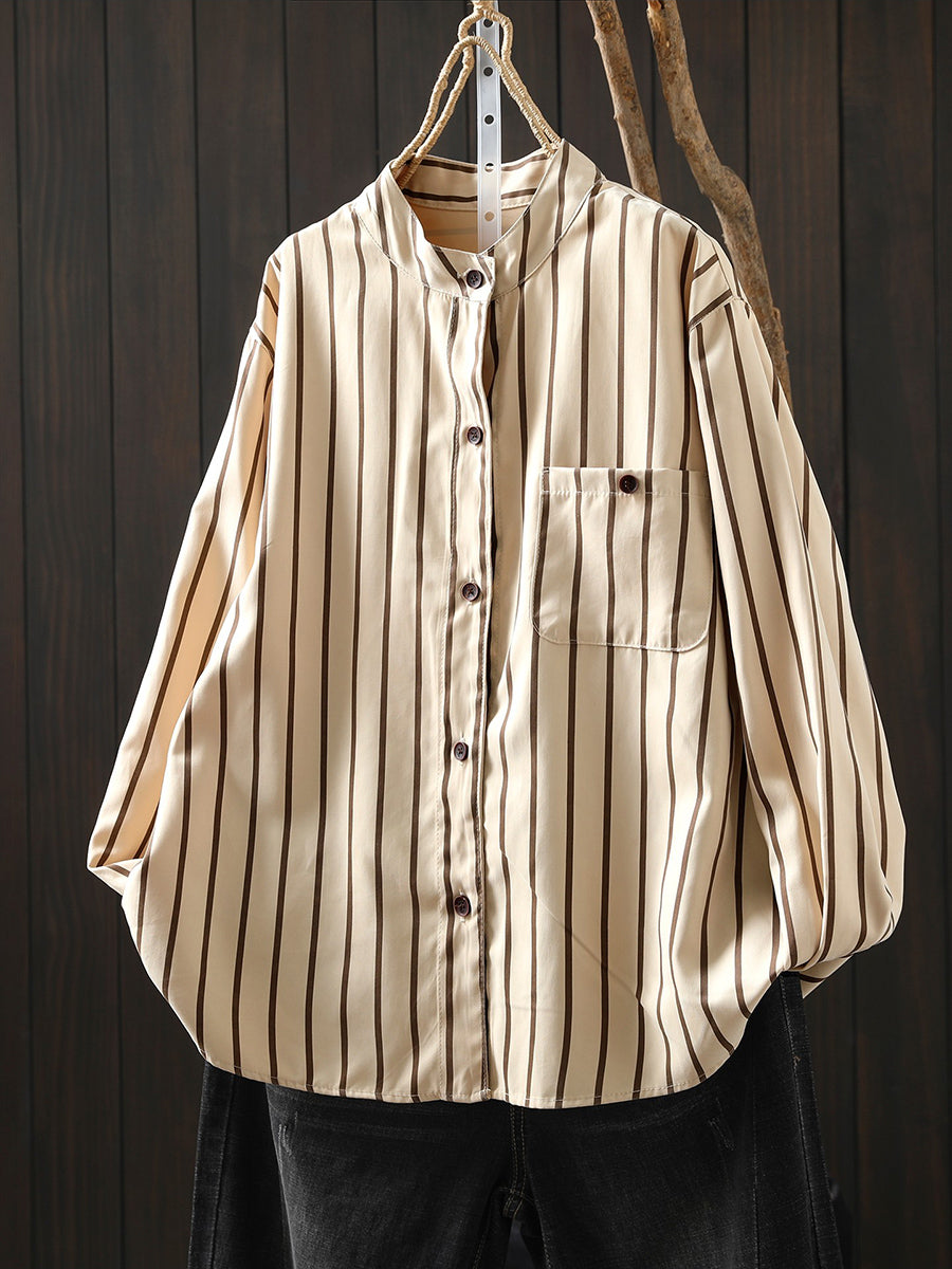 Women Artsy Spring Stripe Stand Collar Cotton Shirt