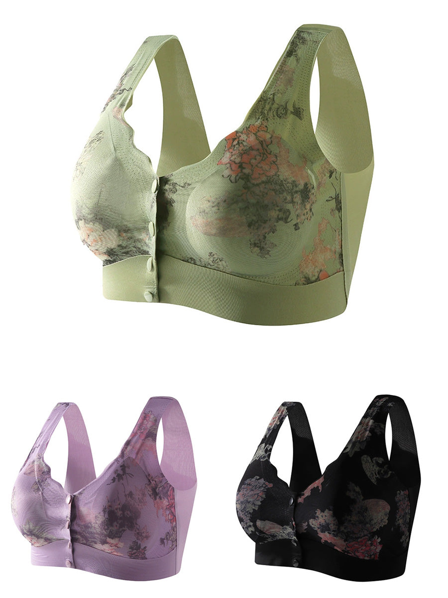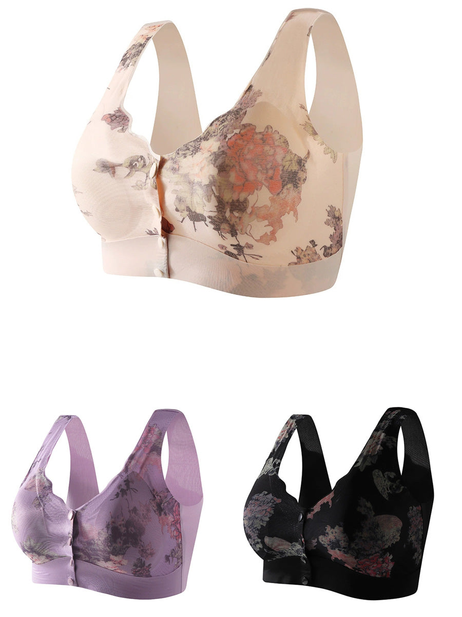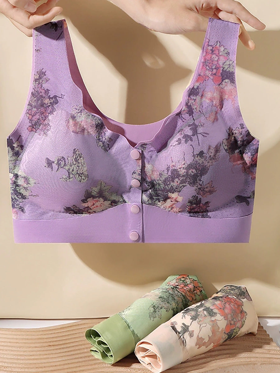 3 Pieces Women Artsy Flower Front-buckle Wireless Bra