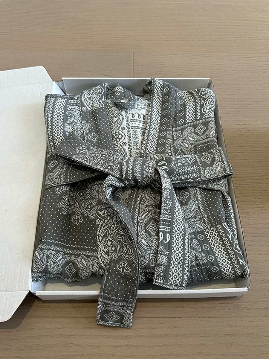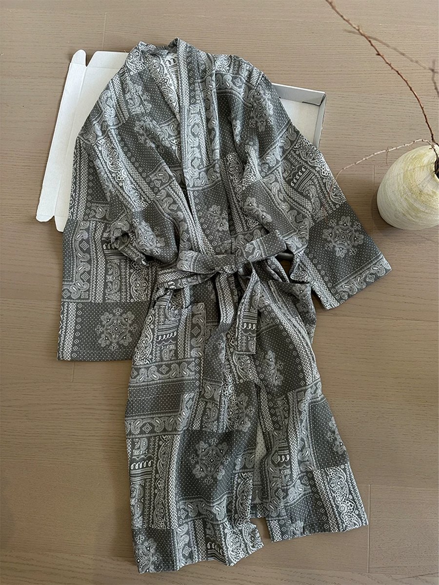 Our Cotton Gauze Bathrobe features a mid to long length that falls below the knee, crafted from 100% Cotton Gauze material. With its soft touch texture and elegant paisley floral pattern design, this breathable and durable bathrobe is perfect for lounging at home or after a shower, offering a stylish and comfortable experience.