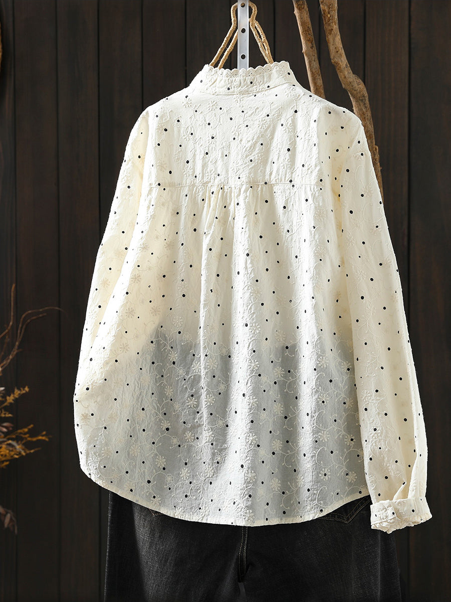 Women Artsy Spring Dot Embroidery 100%Cotton Stand Collar Blouse