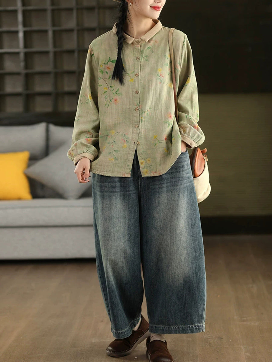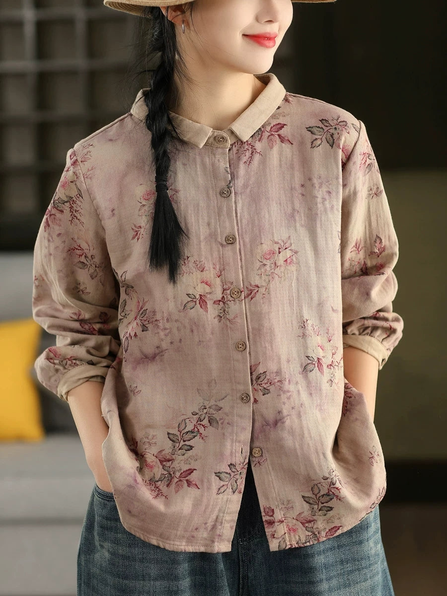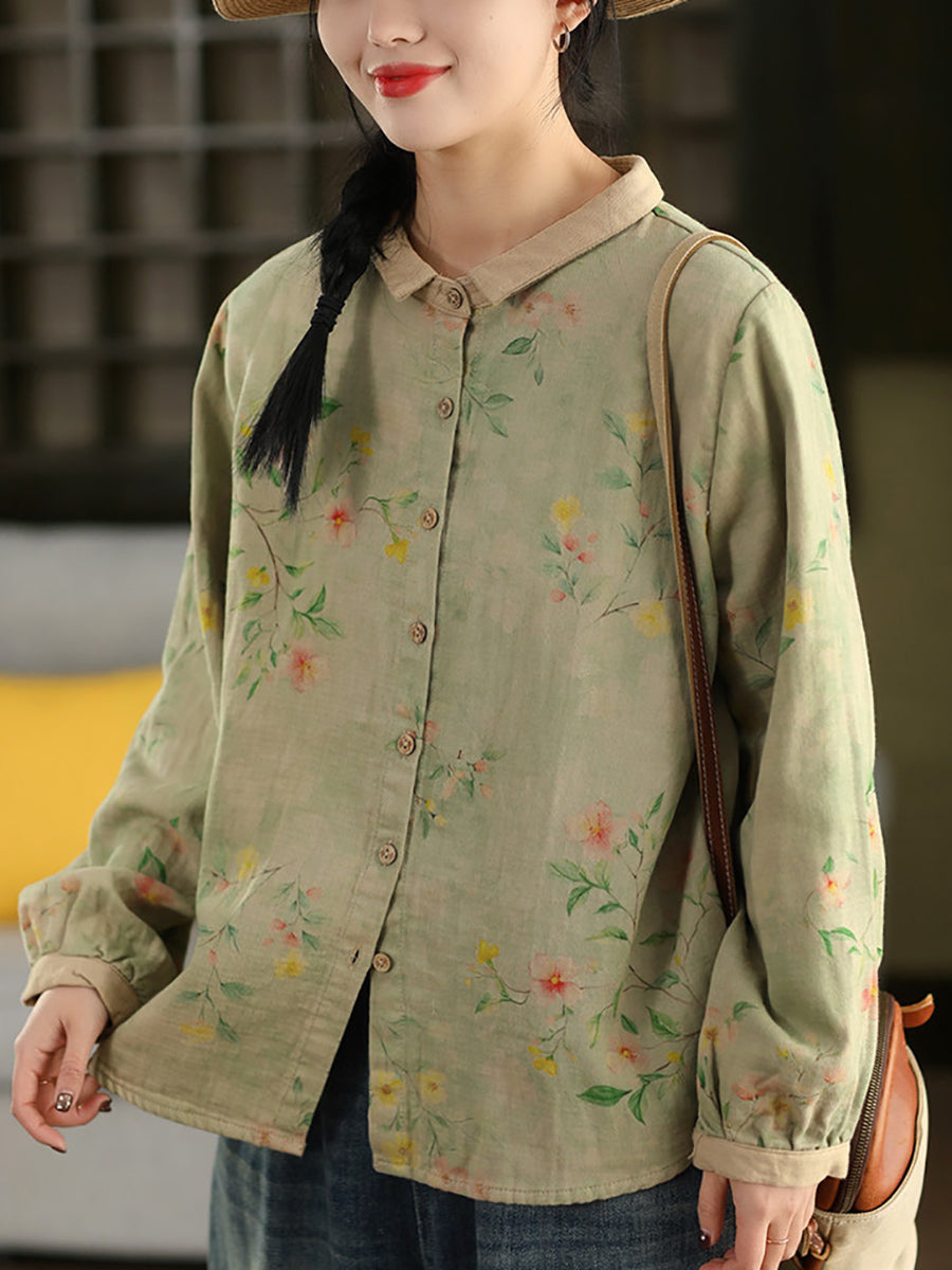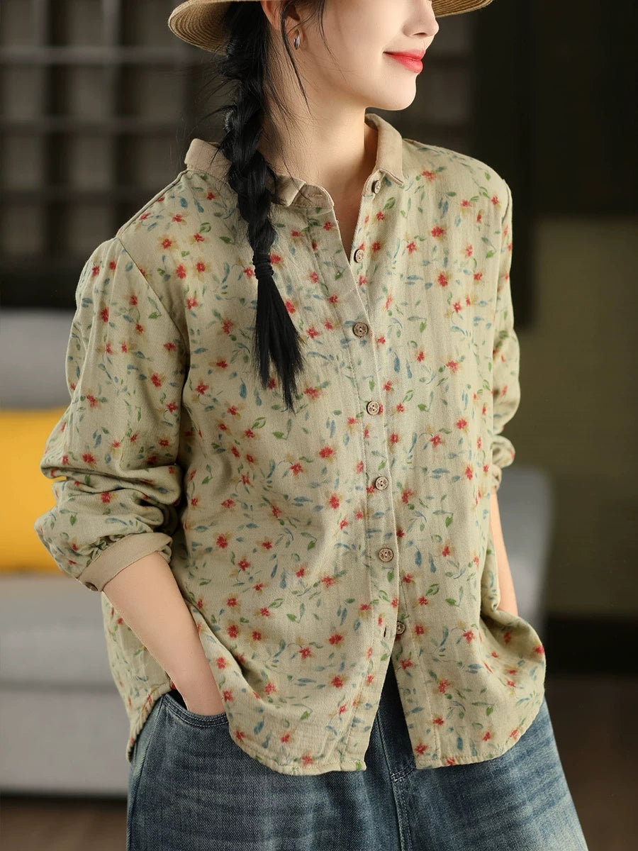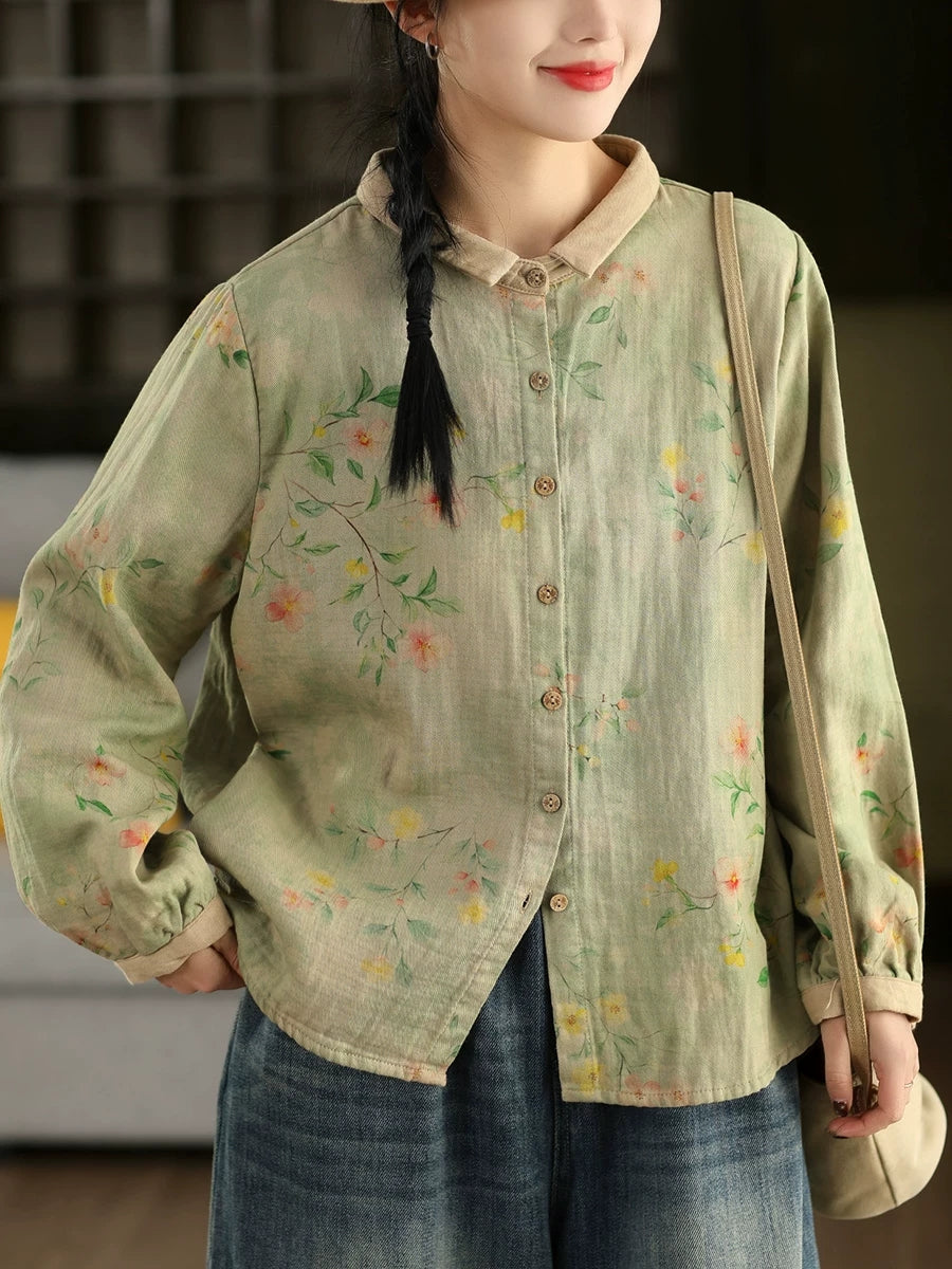 Women Artsy Spring Flower Turn-down Collar 100%Cotton Shirt