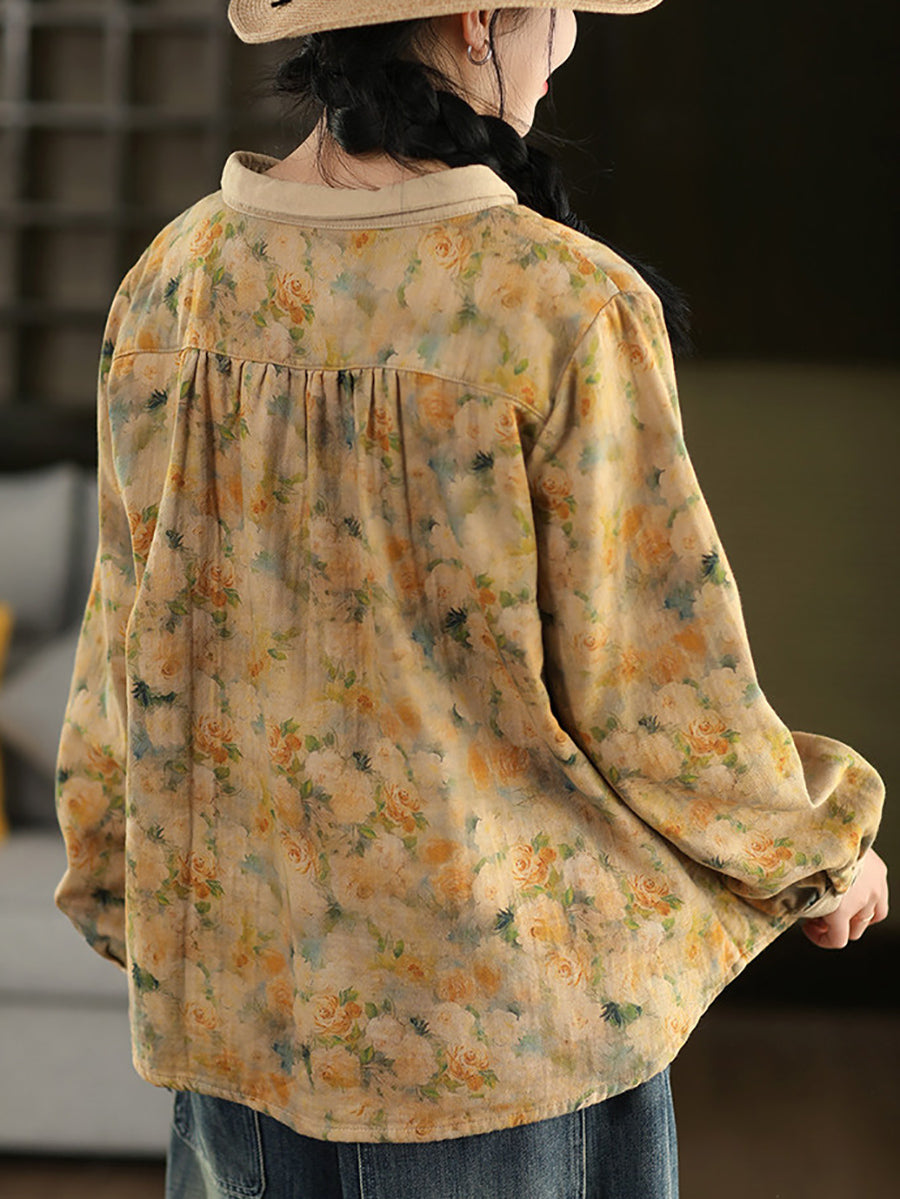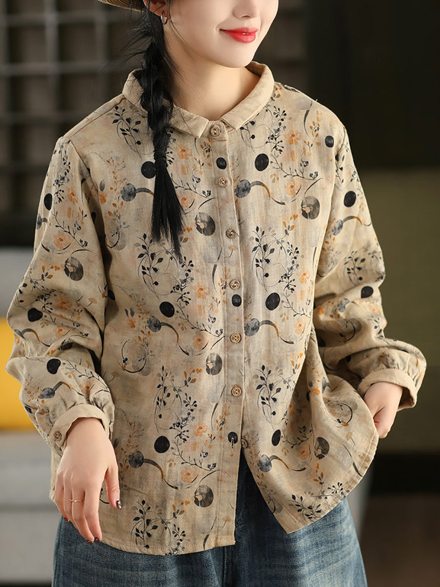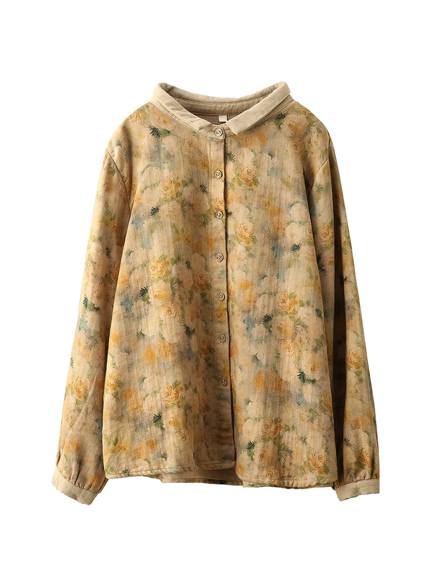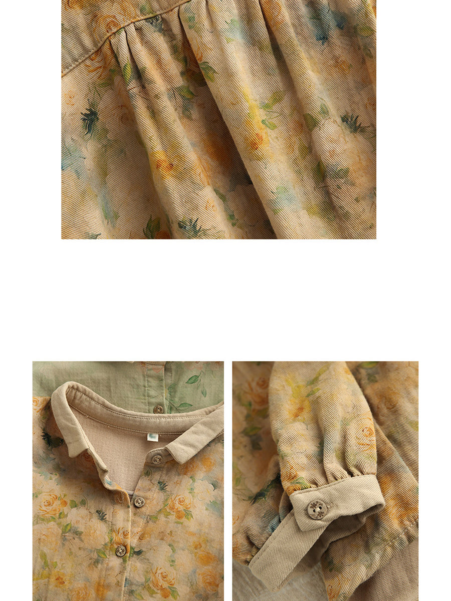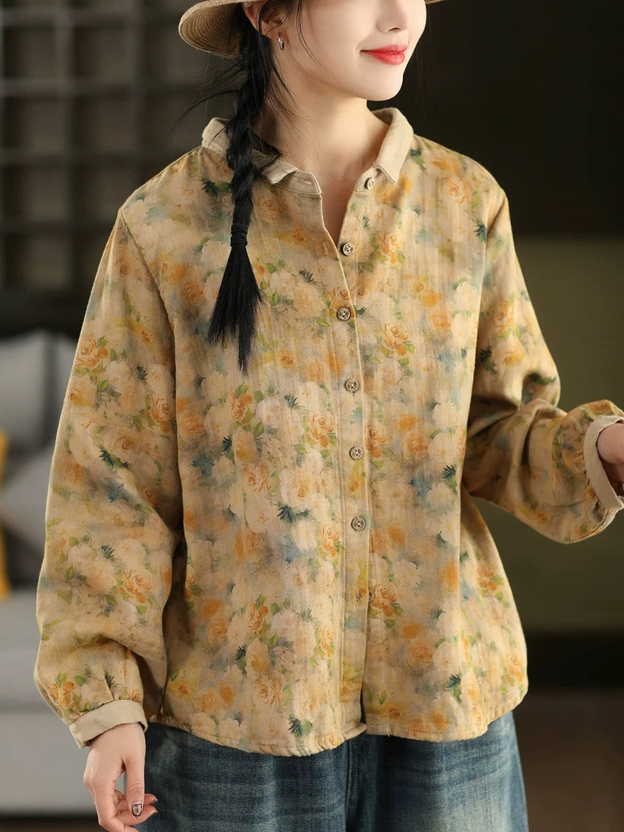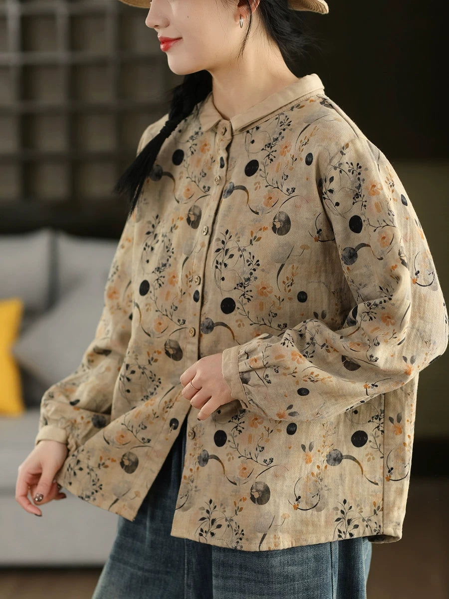 Women Artsy Spring Flower Turn-down Collar 100%Cotton Shirt